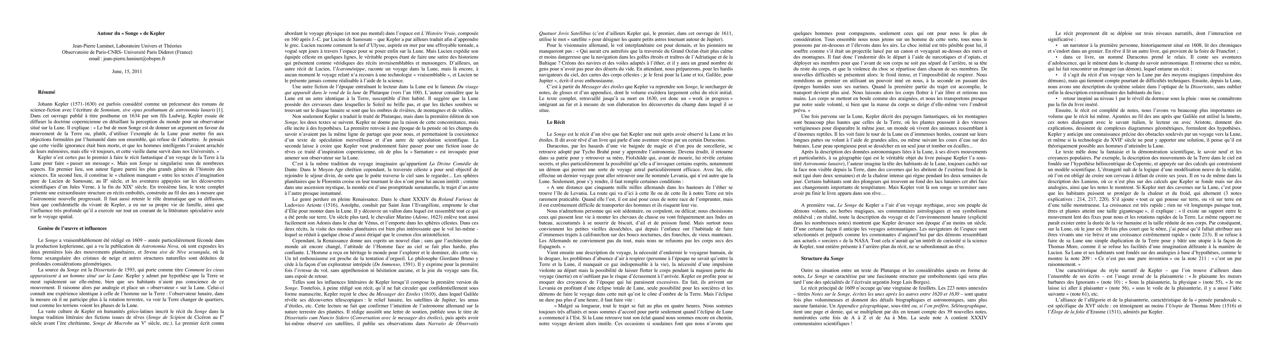 Johann Kepler (1571-1630) is sometimes considered as a precursor of science-fiction novels with the writing of "Somnium, sive opus posthumum of astronomia lunaris". In this work published posthumously in 1634 by his son Ludwig, Kepler intends to defend the Copernican doctrine by detailing the perception of the world for an observer located on the Moon. Although Kepler was not the first to write the fantastic account of a voyage from the Earth to the Moon and "pass around a message", we show here that his "Dream" is made conspicuous under many aspects. Firstly, his author is one of the most remarkable minds of the history of sciences. Secondly, the "Dream" constitutes the missing link between the texts of pure imagination by Lucian of Samosata (IInd c. AD), and the fantasy novels based on scientific discoveries by Jules Verne, at the end of XIXth century. In the third place, the complete text presents an extraordinary structure in encased accounts, built on several series of explanatory notes drafted with the passing of years, as new astronomy progressed. Also it should be retained the dramatic role that its diffusion, although confidential during Kepler's lifetime, had on his own personal and family life, as well as the major influence this book exerted on a whole current of speculative literature devoted to space travel.