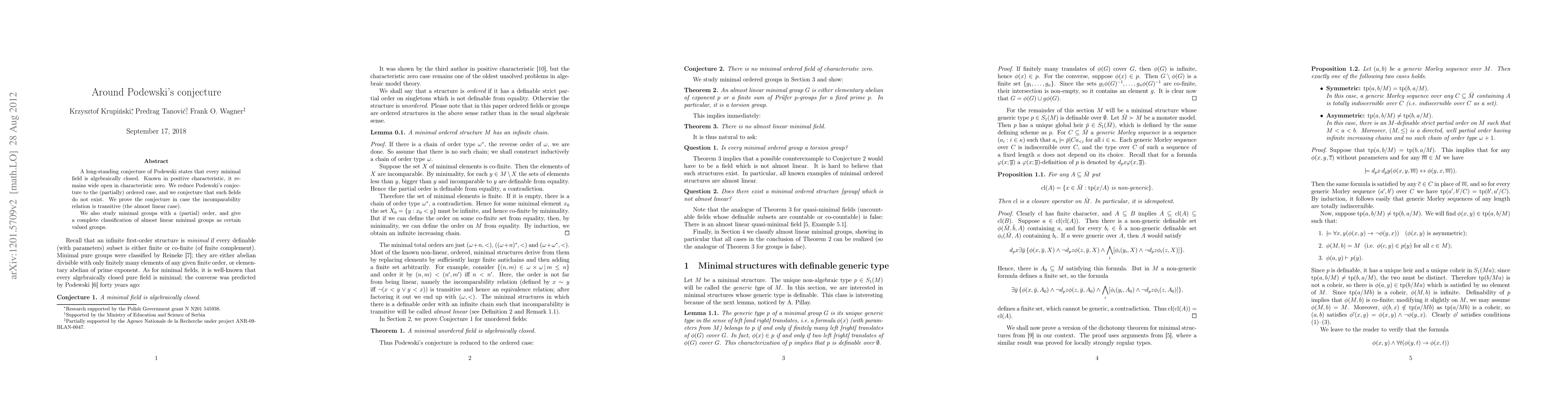 A long-standing conjecture of Podewski states that every minimal field is algebraically closed. It was proved by Wagner for fields of positive characteristic, but it remains wide open in the zero-characteristic case. We reduce Podewski's conjecture to the case of fields having a definable (in the pure field structure), well partial order with an infinite chain, and we conjecture that such fields do not exist. Then we support this conjecture by showing that there is no minimal field interpreting a linear order in a specific way; in our terminology, there is no almost linear, minimal field. On the other hand, we give an example of an almost linear, minimal group $(M,<,+,0)$ of exponent 2, and we show that each almost linear, minimal group is elementary abelian of prime exponent. On the other hand, we give an example of an almost linear, minimal group $(M,<,+,0)$ of exponent 2, and we show that each almost linear, minimal group is torsion.