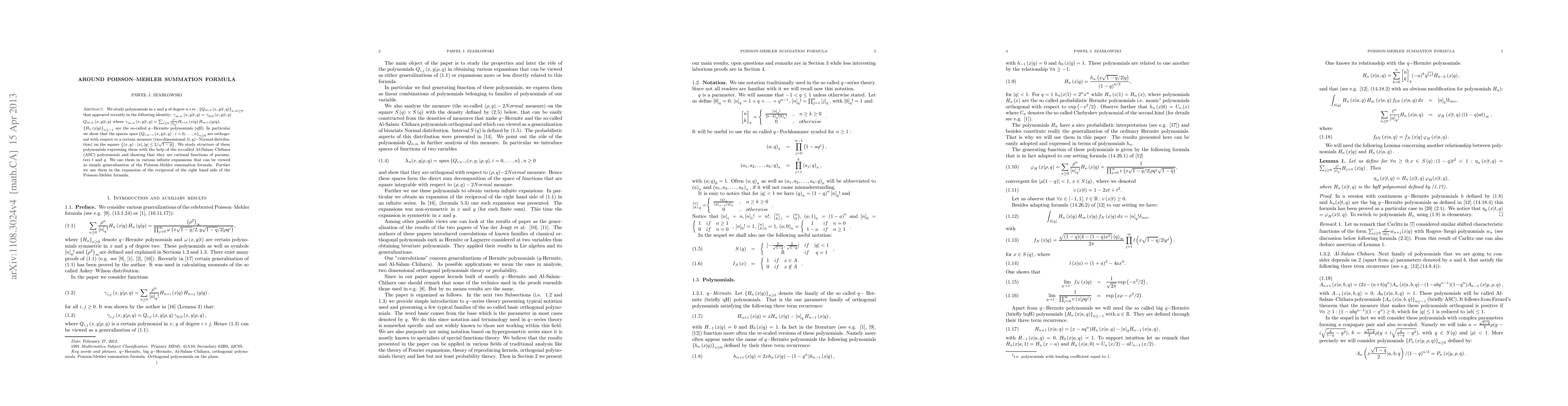 We study polynomials in $x$ and $y$ of degree $n+m:\allowbreak \{Q_{m,n}(x,y|t,q)\}_{n,m\geq 0}$ that appeared recently in the following identity: $\gamma_{m,n}(x,y|t,q) \allowbreak =\allowbreak \gamma_{0,0}(x,y|t,q) \allowbreak Q_{m,n}(x,y|t,q) $ where $\gamma_{m,n}(x,y|t,q) \allowbreak =\allowbreak \sum_{i\geq 0}\frac{t^{i}}{[i]_{q}}H_{i+n}(x|q) H_{m+i}(y|q)$, $\allowbreak $ $\{H_{n}(x|q)}_{n\geq -1}$ are the so-called $q-$% Hermite polynomials (qH). In particular we show that the spaces $span\{Q_{i,n-i}(x,y|t,q) :i=0,...,n\}_{n\geq 0}$ are orthogonal with respect to a certain measure (two-dimensional $(t,q)-$Normal distribution) on the square $\{(x,y):|x|,|y|\leq 2/\sqrt{1-q}\} . $ We study structure of these polynomials expressing them with the help of the so-called Al-Salam--Chihara (ASC) polynomials and showing that they are rational functions of parameters $t$ and $q$. We use them in various infinite expansions that can be viewed as simple generalization of the Poisson-Mehler summation formula. Further we use them in the expansion of the reciprocal of the right hand side of the Poisson-Mehler formula.