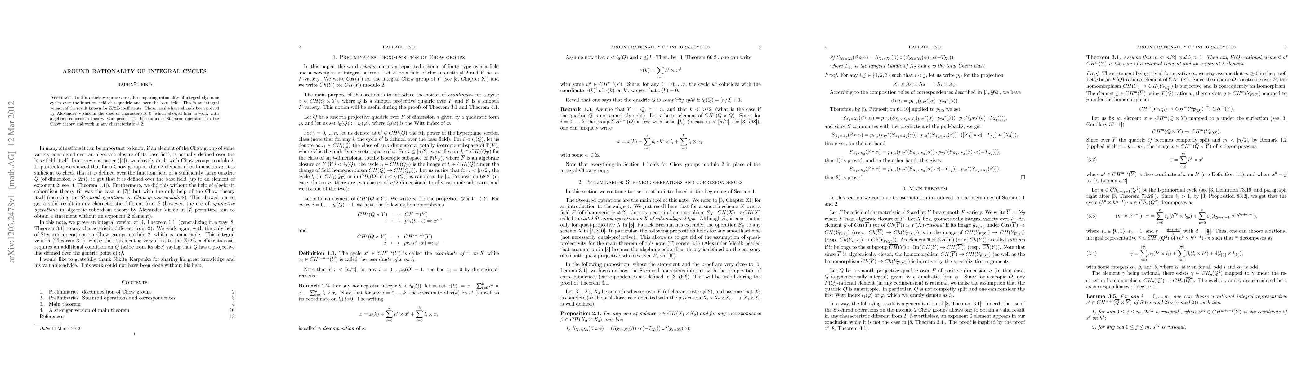 In this article we prove a result comparing rationality of integral algebraic cycles over the function field of a quadric and over the base field. This is an integral version of the result known for coefficients modulo 2. Those results have already been proved by Alexander Vishik in the case of characteristic 0, which allowed him to work with algebraic cobordism theory. Our proofs use the modulo 2 Steenrod operations in the Chow theory and work in any characteristic different from 2.