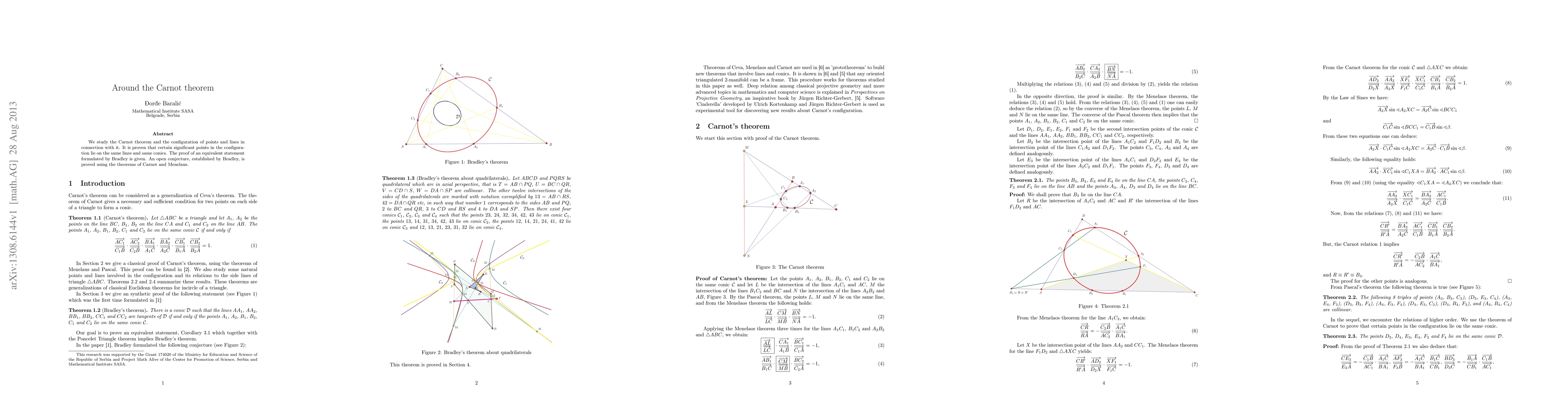This paper investigates the Carnot theorem and its implications on the arrangement of points and lines, proving that certain key points align on shared lines and conics. It also verifies an equivalent statement by Bradley and resolves an open conjecture using Carnot and Menelaus theorems.