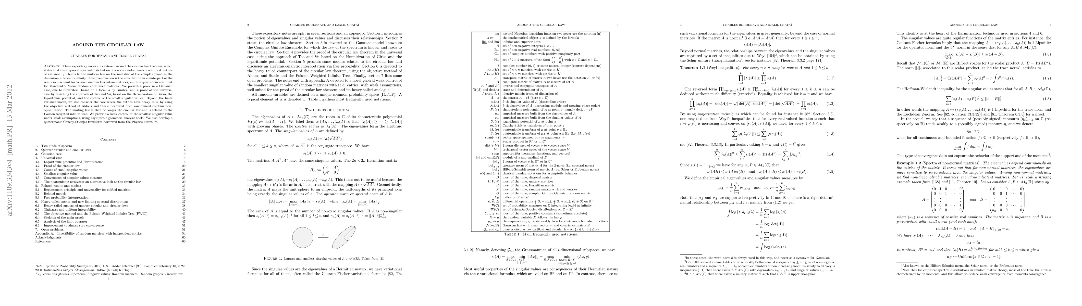 These expository notes are centered around the circular law theorem, which states that the empirical spectral distribution of a nxn random matrix with i.i.d. entries of variance 1/n tends to the uniform law on the unit disc of the complex plane as the dimension $n$ tends to infinity. This phenomenon is the non-Hermitian counterpart of the semi circular limit for Wigner random Hermitian matrices, and the quarter circular limit for Marchenko-Pastur random covariance matrices. We present a proof in a Gaussian case, due to Silverstein, based on a formula by Ginibre, and a proof of the universal case by revisiting the approach of Tao and Vu, based on the Hermitization of Girko, the logarithmic potential, and the control of the small singular values. Beyond the finite variance model, we also consider the case where the entries have heavy tails, by using the objective method of Aldous and Steele borrowed from randomized combinatorial optimization. The limiting law is then no longer the circular law and is related to the Poisson weighted infinite tree. We provide a weak control of the smallest singular value under weak assumptions, using asymptotic geometric analysis tools. We also develop a quaternionic Cauchy-Stieltjes transform borrowed from the Physics literature.