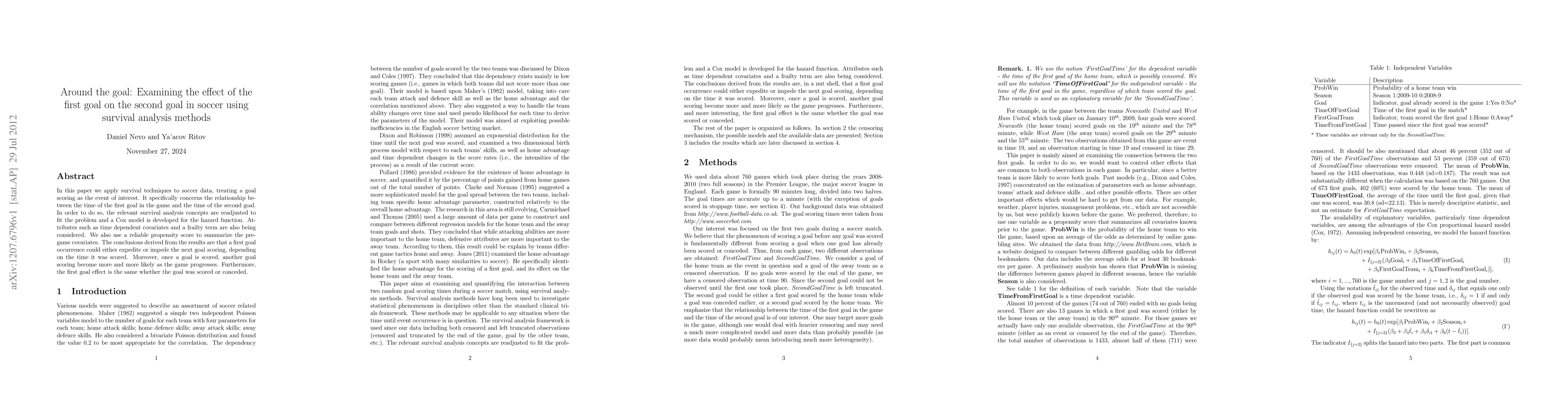 In this paper we apply survival techniques to soccer data, treating a goal scoring as the event of interest. It specifically concerns the relationship between the time of the first goal in the game and the time of the second goal. In order to do so, the relevant survival analysis concepts are readjusted to fit the problem and a Cox model is developed for the hazard function. Attributes such as time dependent covariates and a frailty term are also being considered. We also use a reliable propensity score to summarize the pre-game covariates. The conclusions derived from the results are that a first goal occurrence could either expedite or impede the next goal scoring, depending on the time it was scored. Moreover, once a goal is scored, another goal scoring become more and more likely as the game progresses. Furthermore, the first goal effect is the same whether the goal was scored or conceded.
