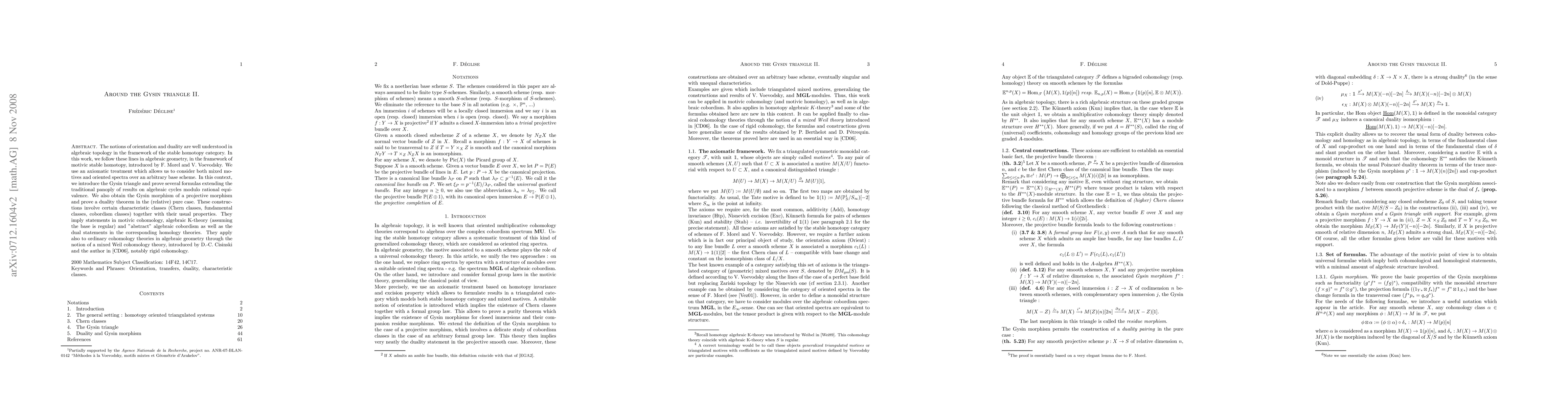 We study the construction and properties of the Gysin triangle in an axiomatic framework which covers triangulated mixed motives and MGl-modules over an arbitrary base S. This allows to define the Gysin morphism associated to a projective morphism between smooth S-schemes and prove duality for projective smooth S-schemes. As part of the construction, cobordism classes are considered and we give a proof of the Myschenko theorem generalized in our context - this in fact gives another proof of the latter theorem in classical stable homotopy through complex realization. Finally, these constructions apply to rigid cohomology through the notion of a mixed Weil theory introduced by D.-C. Cisinski and the author in another work.