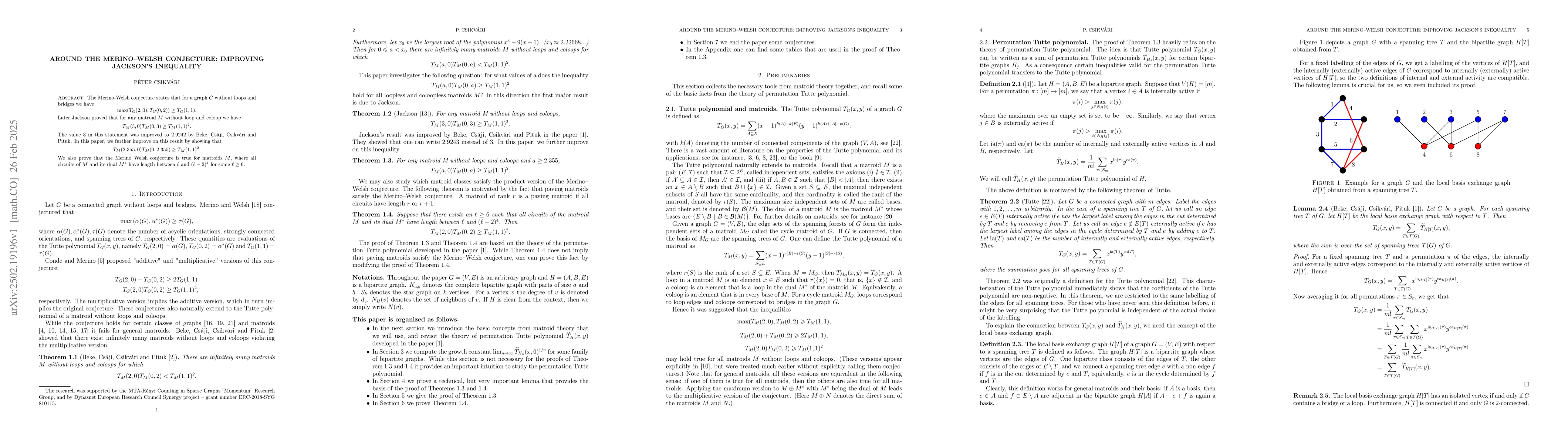 The research employs an analytical approach, improving Jackson's inequality related to the Merino-Welsh conjecture by refining the value from 2.9242 to 2.355 and proving the conjecture for matroids with specific circuit length constraints.