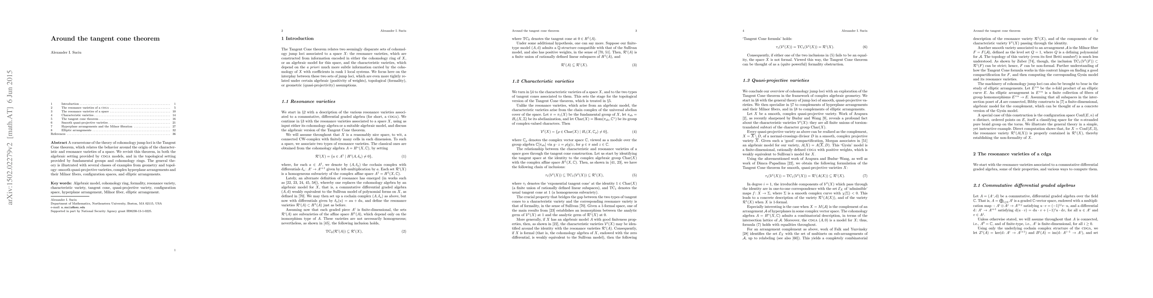 The paper revisits the Tangent Cone theorem in algebraic and topological settings, exploring its connections to cohomology jump loci in various geometric and topological contexts.