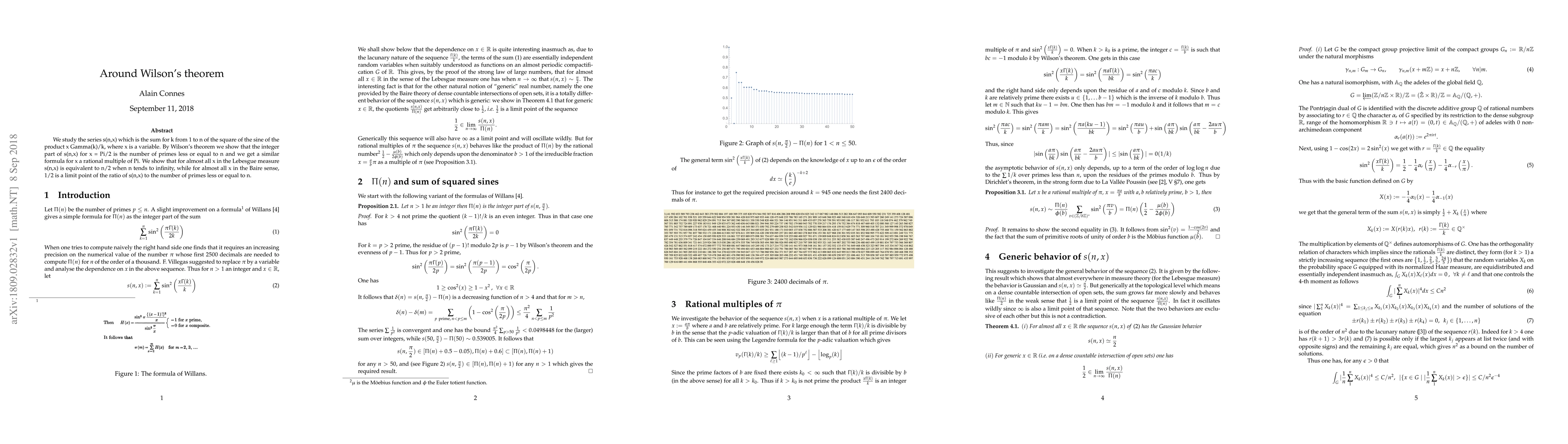 We study the series s(n,x) which is the sum for k from 1 to n of the square of the sine of the product x Gamma(k)/k, where x is a variable. By Wilson's theorem we show that the integer part of s(n,x) for x = Pi/2 is the number of primes less or equal to n and we get a similar formula for x a rational multiple of Pi. We show that for almost all x in the Lebesgue measure s(n,x) is equivalent to n/2 when n tends to infinity, while for almost all x in the Baire sense, 1/2 is a limit point of the ratio of s(n,x) to the number of primes less or equal to n.