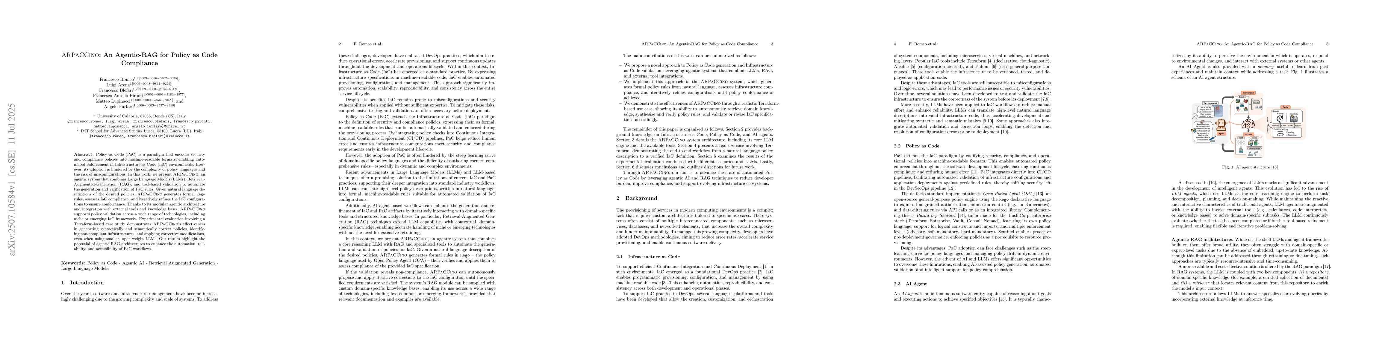 ARPaCCino introduces an agentic system that combines LLMs, RAG, and tool-based validation to automate the generation and verification of PaC rules, supporting policy validation across various IaC frameworks.
