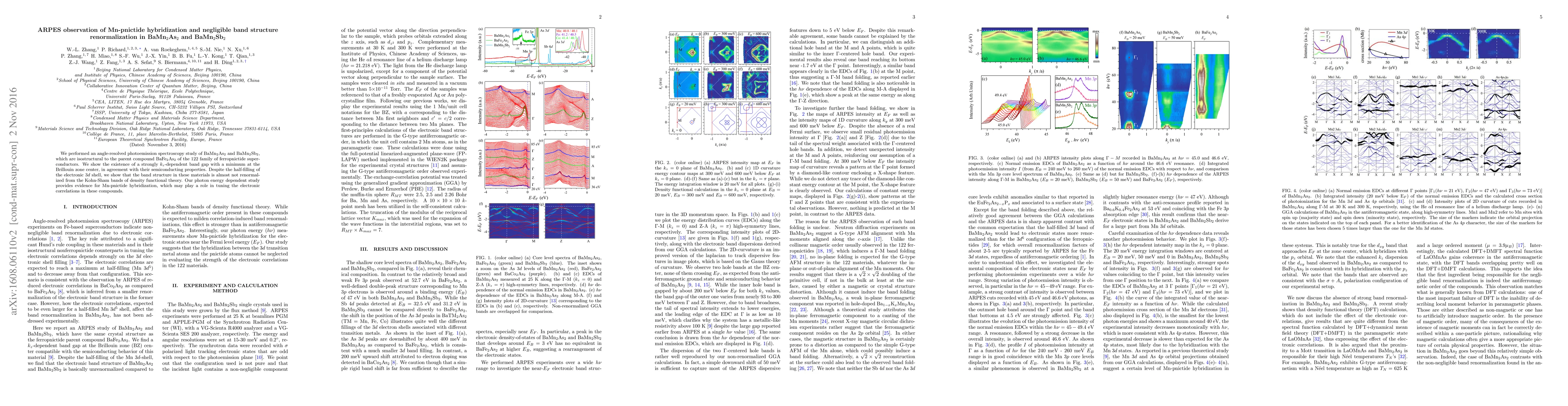 This study uses angle-resolved photoemission spectroscopy to investigate BaMn$_2$As$_2$ and BaMn$_2$Sb$_2$, revealing a strongly $k_z$-dependent band gap and minimal band structure renormalization despite half-filled Mn 3$d$ shells. Evidence of Mn-pnictide hybridization suggests its role in electronic correlations in these materials.