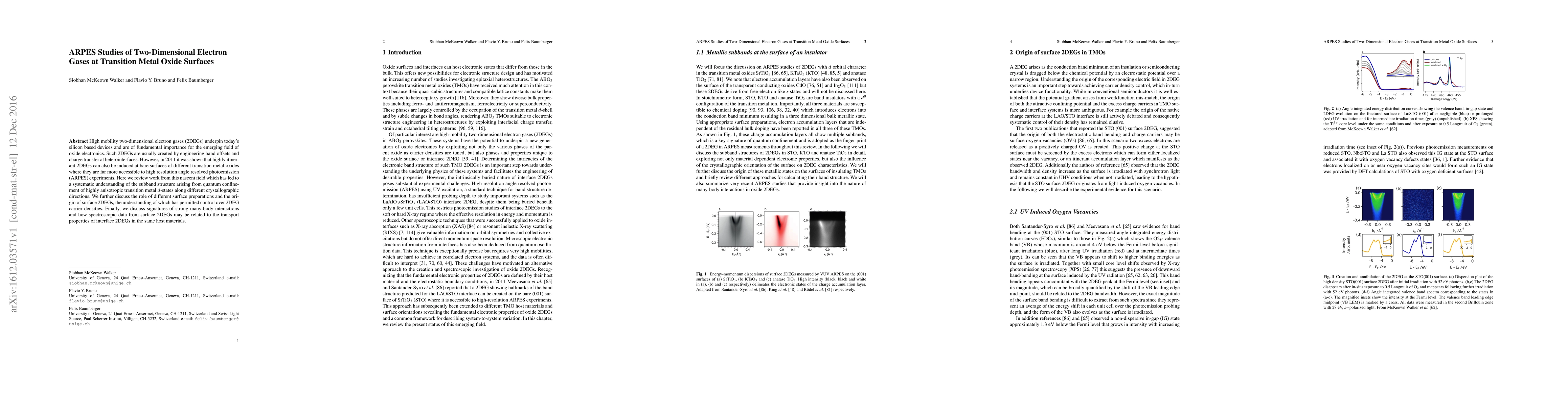This paper reviews ARPES studies on two-dimensional electron gases (2DEGs) at transition metal oxide surfaces, highlighting the systematic understanding of their subband structure and the influence of surface preparations on carrier densities. It also explores the implications of strong many-body interactions and the correlation between spectroscopic data and transport properties.