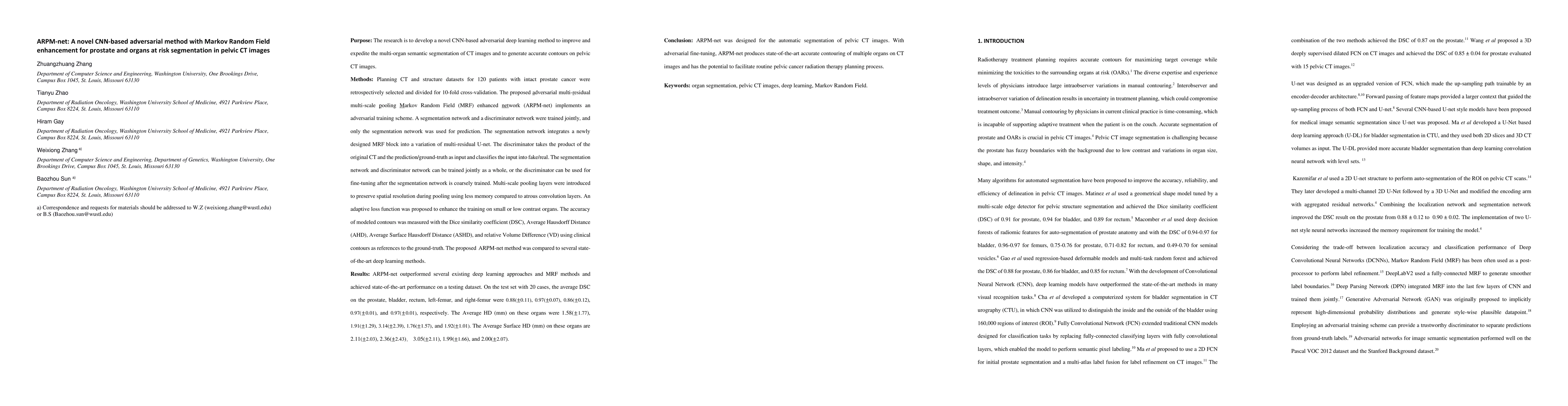 This paper proposes ARPM-net, a CNN-based adversarial network enhanced with Markov Random Field for improved segmentation of prostate and organs at risk in pelvic CT images. The method integrates multi-residual U-net with an MRF block and multi-scale pooling, achieving better accuracy compared to other deep learning techniques.