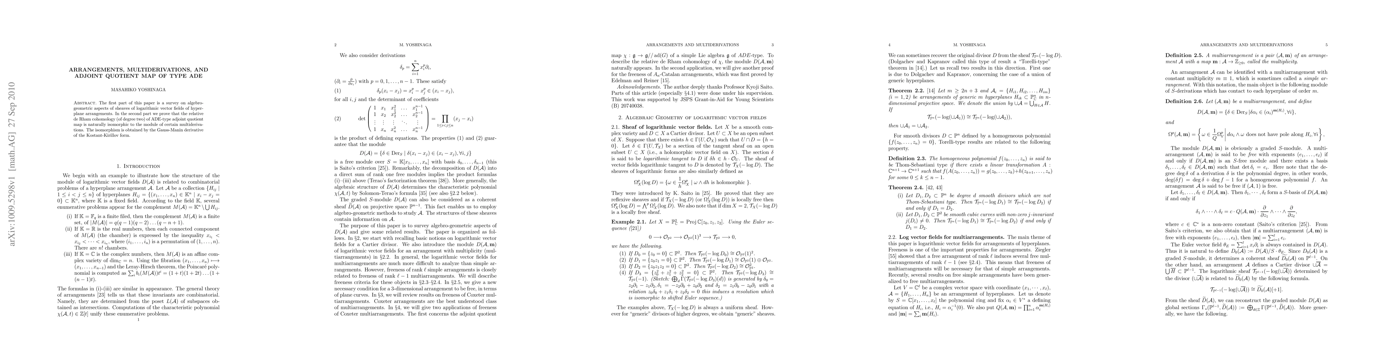 The first part of this paper is a survey on algebro-geometric aspects of sheaves of logarithmic vector fields of hyperplane arrangements. In the second part we prove that the relative de Rham cohomology (of degree two) of ADE-type adjoint quotient map is naturally isomorphic to the module of certain multiderivations. The isomorphism is obtained by the Gauss-Manin derivative of the Kostant-Kirillov form.