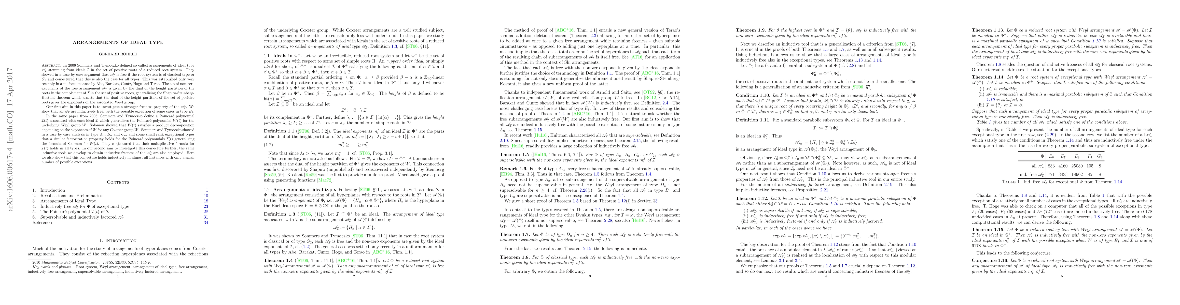 Researchers investigate a stronger freeness property of arrangements of ideal type A_I in root systems, showing that all but possibly some cases in type E_8 are inductively free, and confirm a conjecture about the factorization property of Poincaré polynomials I(t) in most types.