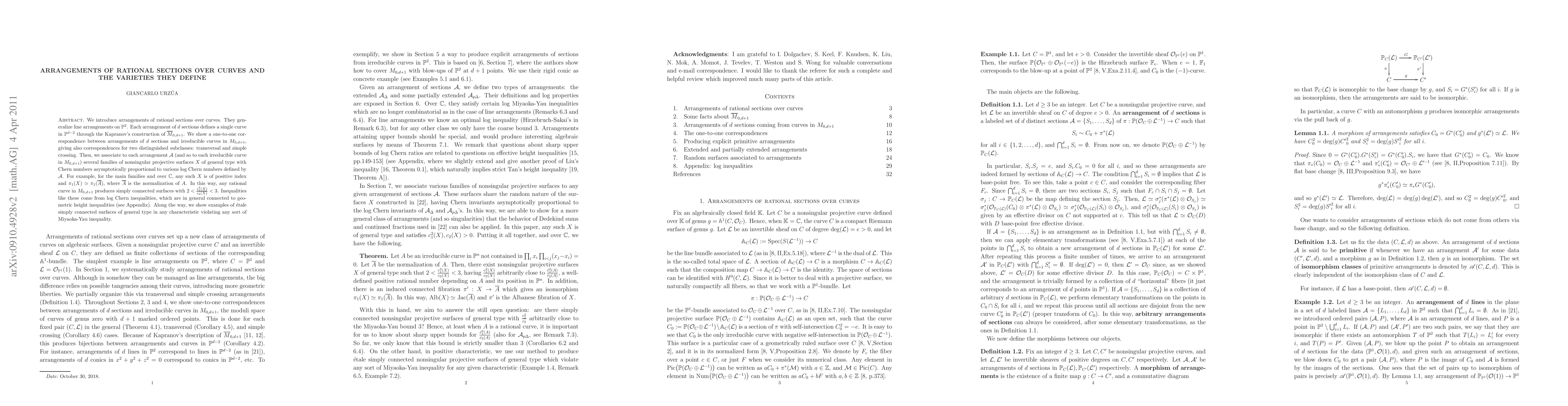 This paper explores arrangements of rational sections over curves, generalizing line arrangements in P^2, and demonstrates a one-to-one correspondence between these arrangements and irreducible curves in M_{0,d+1}. It also links these arrangements to families of nonsingular projective surfaces of general type, showing they satisfy certain Chern number inequalities.