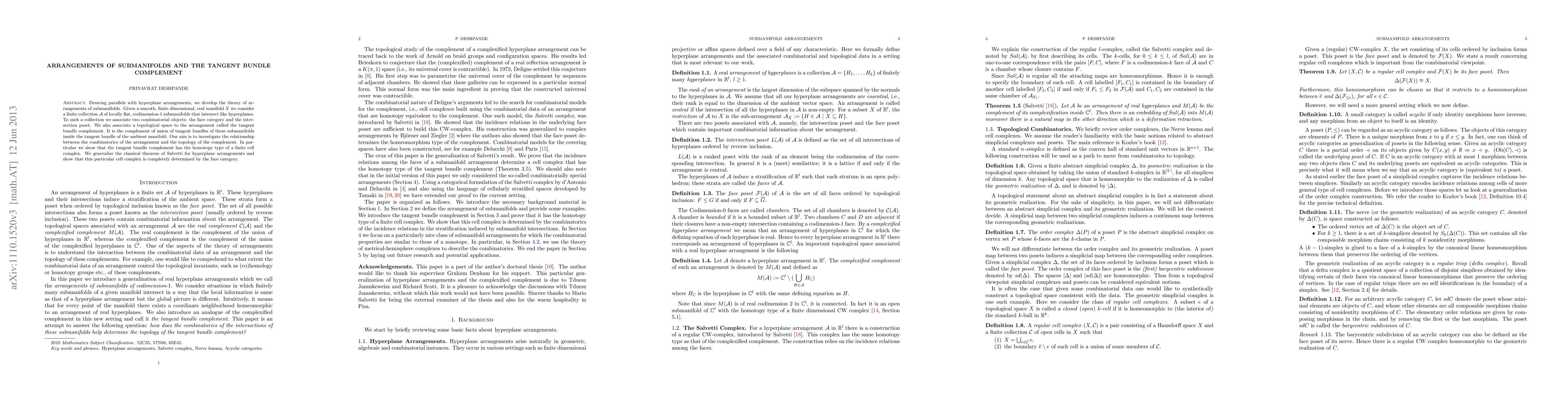 Drawing parallels with hyperplane arrangements, we develop the theory of arrangements of submanifolds. Given a smooth, finite dimensional, real manifold $X$ we consider a finite collection $\mathcal{A}$ of locally flat, codimension-1 submanifolds that intersect like hyperplanes. To such a collection we associate two combinatorial objects: the face category and the intersection poset. We also associate a topological space to the arrangement called the tangent bundle complement. It is the complement of union of tangent bundles of these submanifolds inside the tangent bundle of the ambient manifold. Our aim is to investigate the relationship between the combinatorics of the arrangement and the topology of the complement. In particular we show that the tangent bundle complement has the homotopy type of a finite cell complex. We generalize the classical theorem of Salvetti for hyperplane arrangements and show that this particular cell complex is completely determined by the face category.