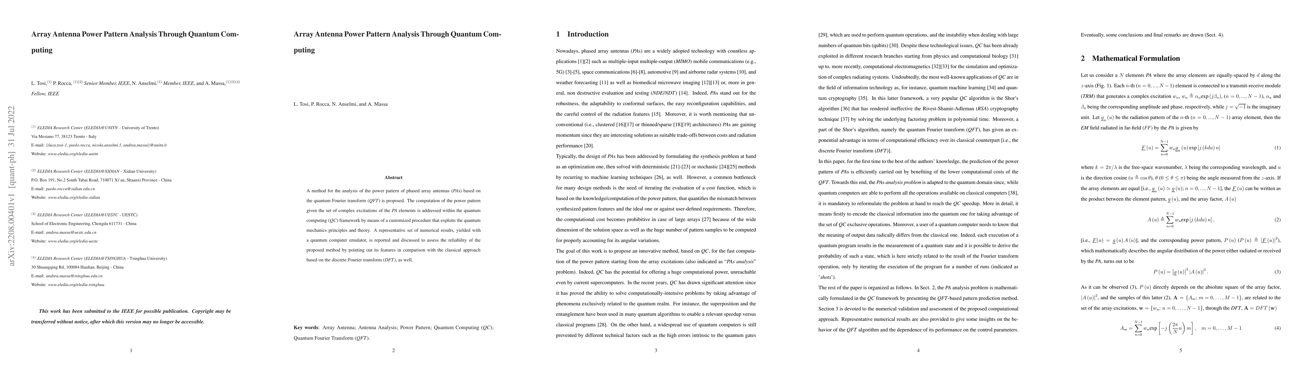 A method for the analysis of the power pattern of phased array antennas (PAs) based on the quantum Fourier transform (QFT) is proposed. The computation of the power pattern given the set of complex excitations of the PA elements is addressed within the quantum computing (QC) framework by means of a customized procedure that exploits the quantum mechanics principles and theory. A representative set of numerical results, yielded with a quantum computer emulator, is reported and discussed to assess the reliability of the proposed method by pointing out its features in comparison with the classical approach based on the discrete Fourier transform (DFT), as well.