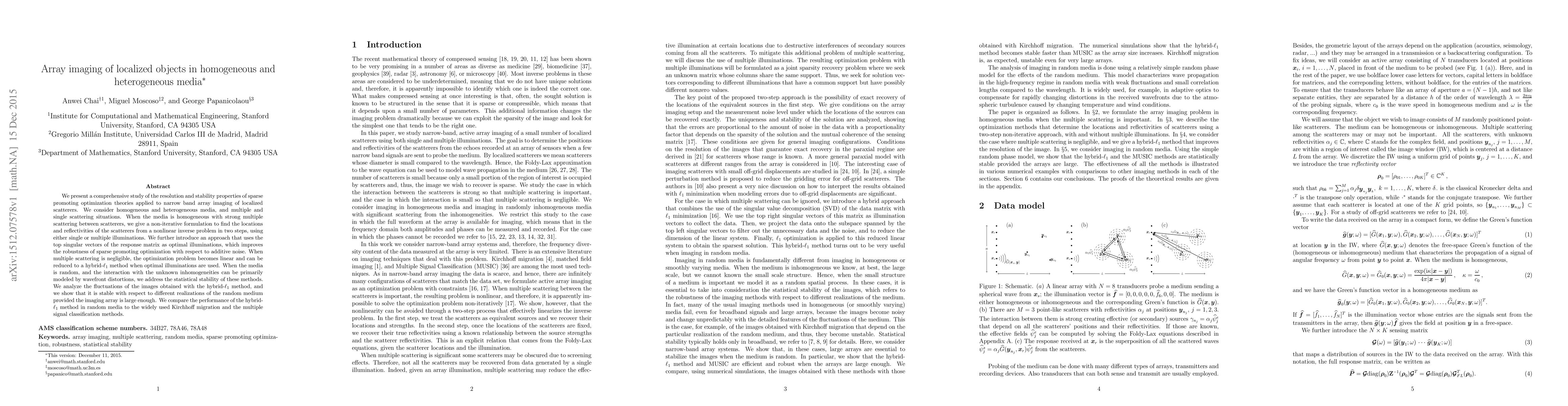 We present a comprehensive study of the resolution and stability properties of sparse promoting optimization theories applied to narrow band array imaging of localized scatterers. We consider homogeneous and heterogeneous media, and multiple and single scattering situations. When the media is homogeneous with strong multiple scattering between scatterers, we give a non-iterative formulation to find the locations and reflectivities of the scatterers from a nonlinear inverse problem in two steps, using either single or multiple illuminations. We further introduce an approach that uses the top singular vectors of the response matrix as optimal illuminations, which improves the robustness of sparse promoting optimization with respect to additive noise. When multiple scattering is negligible, the optimization problem becomes linear and can be reduced to a hybrid-$\ell_1$ method when optimal illuminations are used. When the media is random, and the interaction with the unknown inhomogeneities can be primarily modeled by wavefront distortions, we address the statistical stability of these methods. We analyze the fluctuations of the images obtained with the hybrid-$\ell_1$ method, and we show that it is stable with respect to different realizations of the random medium provided the imaging array is large enough. We compare the performance of the hybrid-$\ell_1$ method in random media to the widely used Kirchhoff migration and the multiple signal classification methods.