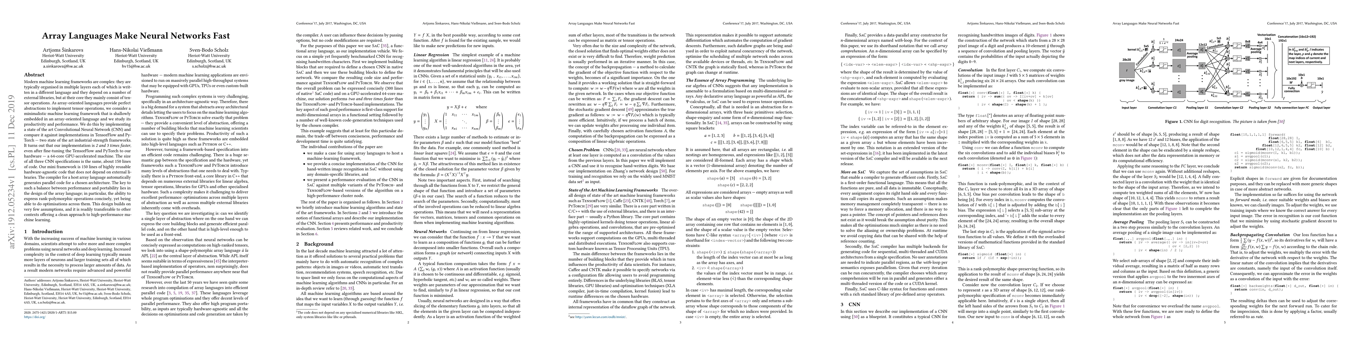 Modern machine learning frameworks are complex: they are typically organised in multiple layers each of which is written in a different language and they depend on a number of external libraries, but at their core they mainly consist of tensor operations. As array-oriented languages provide perfect abstractions to implement tensor operations, we consider a minimalistic machine learning framework that is shallowly embedded in an array-oriented language and we study its productivity and performance. We do this by implementing a state of the art Convolutional Neural Network (CNN) and compare it against implementations in TensorFlow and PyTorch --- two state of the art industrial-strength frameworks. It turns out that our implementation is 2 and 3 times faster, even after fine-tuning the TensorFlow and PyTorch to our hardware --- a 64-core GPU-accelerated machine. The size of all three CNN specifications is the same, about 150 lines of code. Our mini framework is 150 lines of highly reusable hardware-agnostic code that does not depend on external libraries. The compiler for a host array language automatically generates parallel code for a chosen architecture. The key to such a balance between performance and portability lies in the design of the array language; in particular, the ability to express rank-polymorphic operations concisely, yet being able to do optimisations across them. This design builds on very few assumptions, and it is readily transferable to other contexts offering a clean approach to high-performance machine learning.
