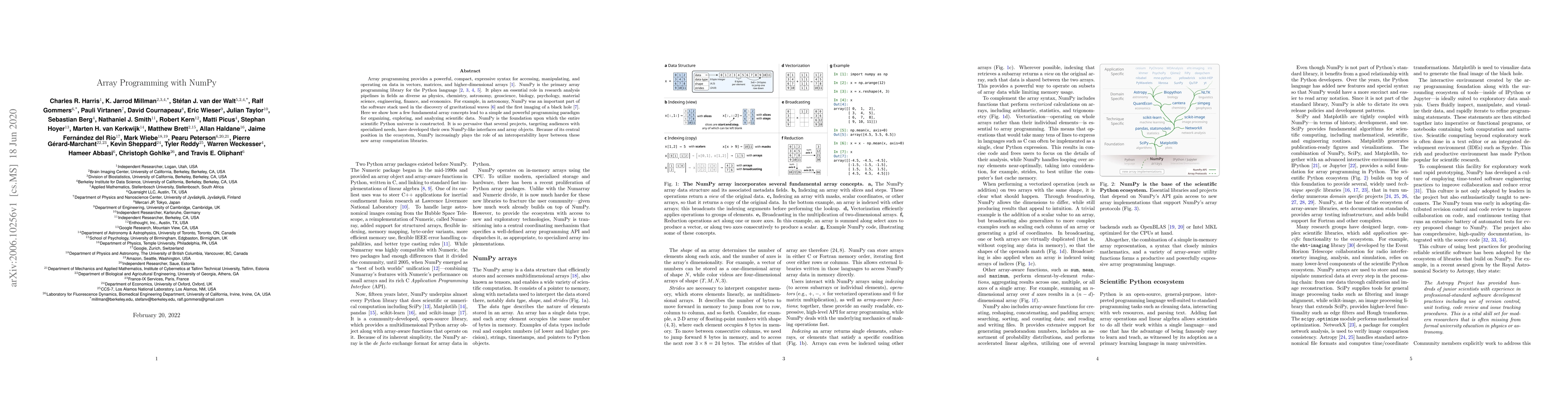 Array programming provides a powerful, compact, expressive syntax for accessing, manipulating, and operating on data in vectors, matrices, and higher-dimensional arrays. NumPy is the primary array programming library for the Python language. It plays an essential role in research analysis pipelines in fields as diverse as physics, chemistry, astronomy, geoscience, biology, psychology, material science, engineering, finance, and economics. For example, in astronomy, NumPy was an important part of the software stack used in the discovery of gravitational waves and the first imaging of a black hole. Here we show how a few fundamental array concepts lead to a simple and powerful programming paradigm for organizing, exploring, and analyzing scientific data. NumPy is the foundation upon which the entire scientific Python universe is constructed. It is so pervasive that several projects, targeting audiences with specialized needs, have developed their own NumPy-like interfaces and array objects. Because of its central position in the ecosystem, NumPy increasingly plays the role of an interoperability layer between these new array computation libraries.