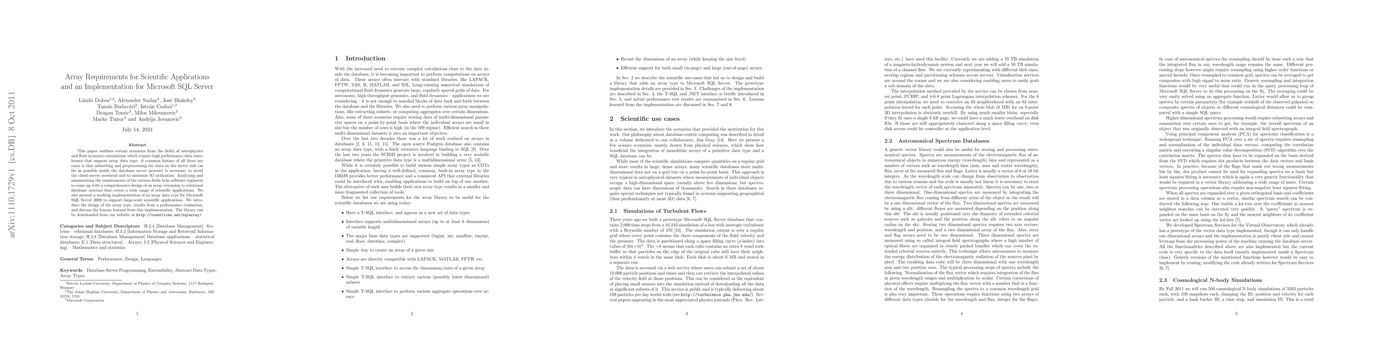 This paper explores the necessity of array data types in scientific applications like astrophysics and fluid dynamics, proposing an array extension for relational databases to minimize client-server overhead. It presents an implementation of this array type for Microsoft SQL Server 2008, along with performance evaluation results and insights from the development process.