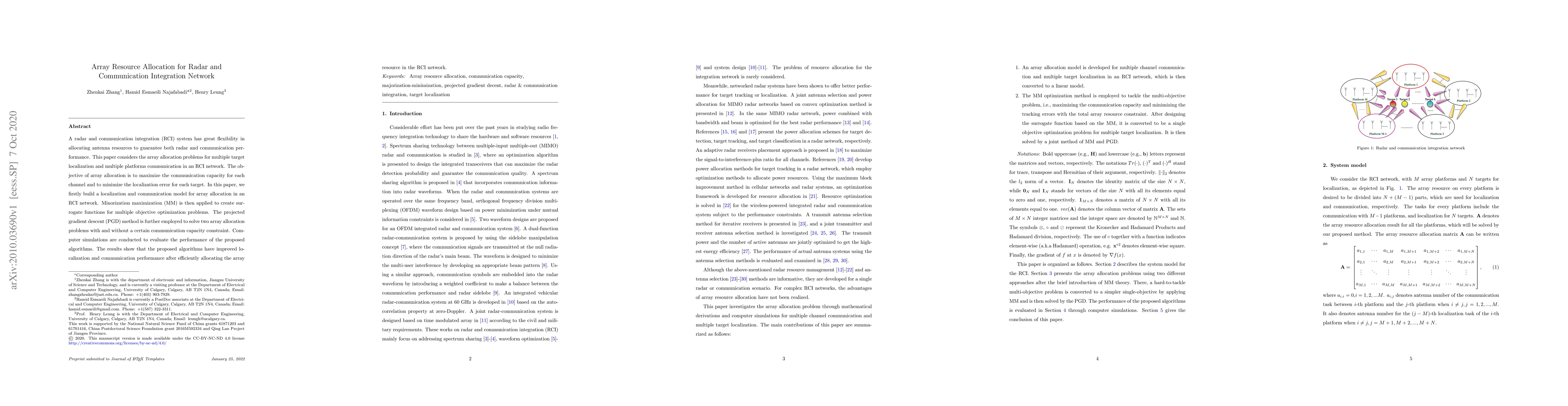 This paper proposes algorithms for optimizing array resource allocation in radar and communication integration networks to enhance both radar target localization and communication capacity. It employs minorization maximization and projected gradient descent to solve allocation problems, demonstrating improved performance through simulations.