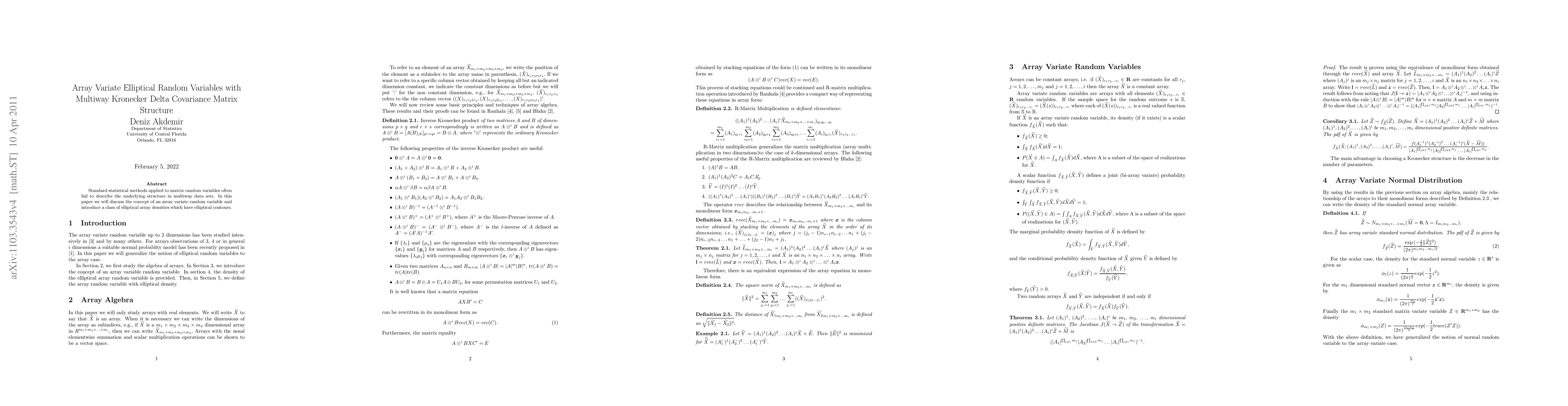 Summary: This paper introduces array variate elliptical random variables and proposes a new class of elliptical densities with a multiway Kronecker delta covariance matrix structure to better describe complex multiway data sets where standard statistical methods fall short.
