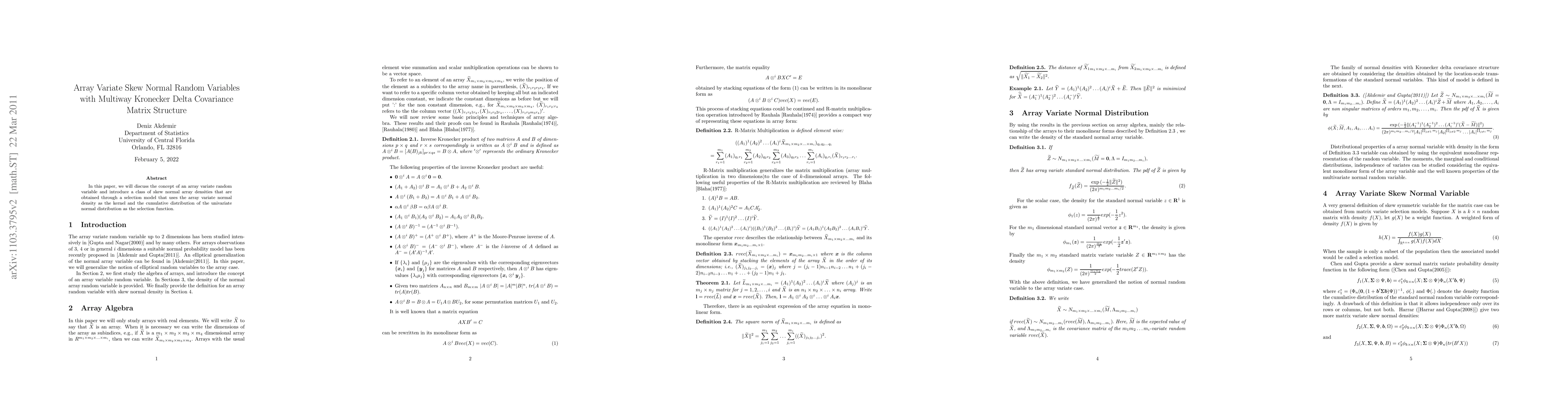 Summary: This research introduces skew normal array variates constructed via a selection model utilizing the array variate normal density and the univariate normal cumulative distribution, focusing on their covariance matrix structure. The paper explores the implications and applications of this new class of distributions.