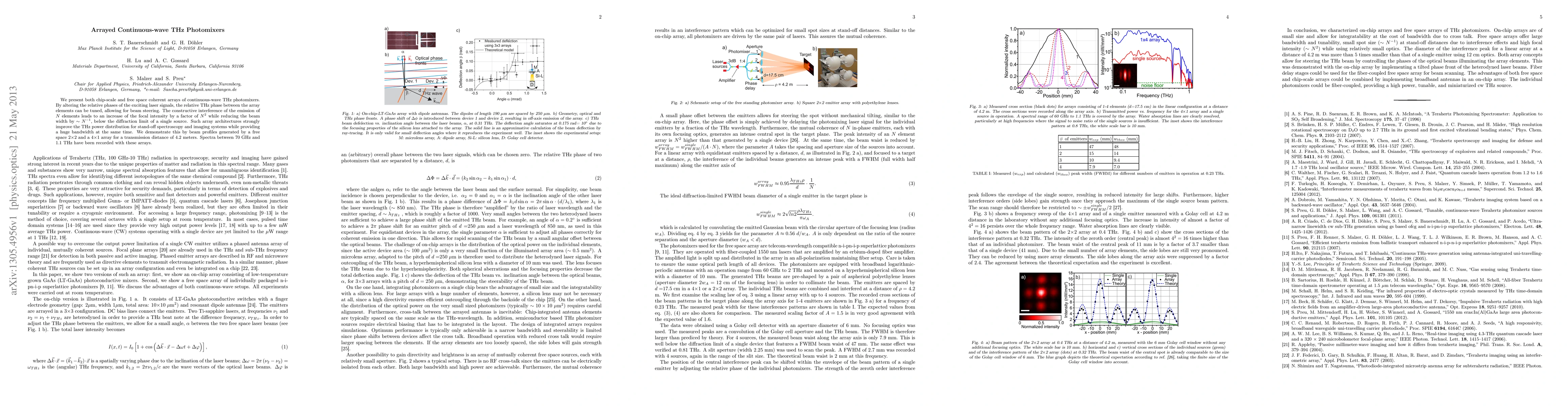 The paper introduces chip-scale and free space arrays of continuous-wave THz photomixers, capable of tuning THz phase for beam steering and enhancing focal intensity. Demonstrated through 2x2 and 4x1 arrays, these architectures significantly improve THz power distribution for long-range spectroscopy and imaging, recording spectra from 70 GHz to 1.1 THz over 4.2 meters.