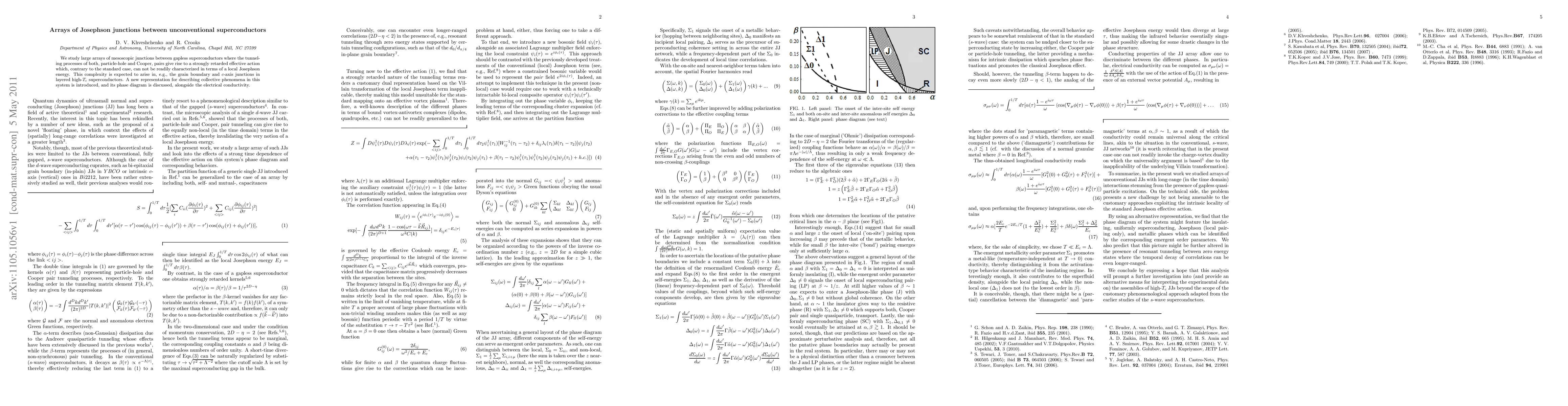 This paper investigates arrays of Josephson junctions between unconventional superconductors, revealing a strongly retarded effective action due to tunneling processes that cannot be characterized by a local Josephson energy. A new representation is introduced to describe collective phenomena, and the study discusses its phase diagram and electrical conductivity.