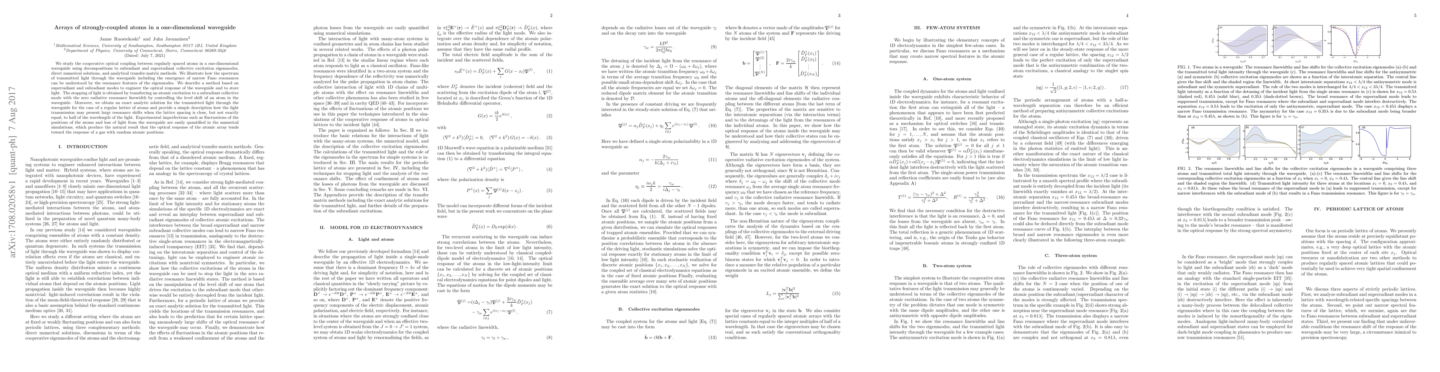 This paper explores cooperative optical coupling between regularly spaced atoms in a one-dimensional waveguide, utilizing subradiant and superradiant modes to engineer optical response and store light. It demonstrates how Fano resonances arise and provides an exact analytic solution for light transmission, detailing how resonance shifts occur when lattice spacing is nearly half the light wavelength.
