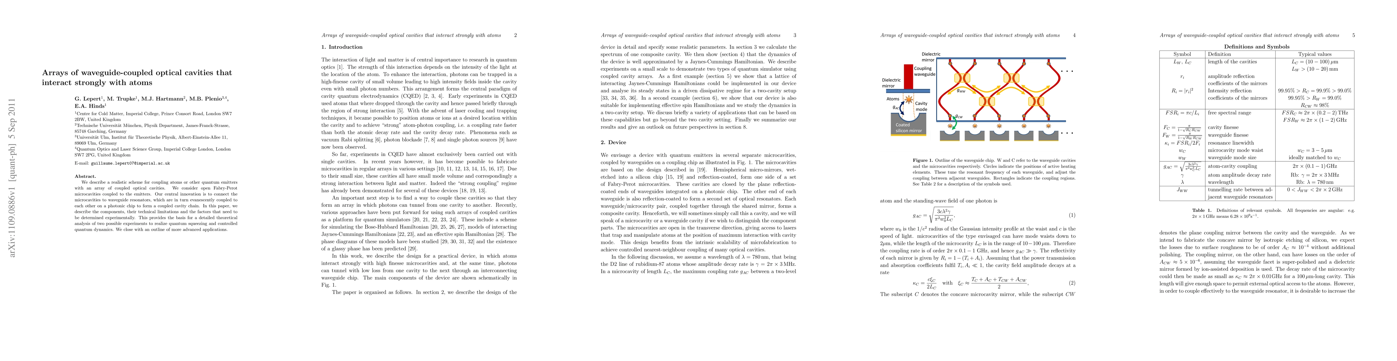 We describe a realistic scheme for coupling atoms or other quantum emitters with an array of coupled optical cavities. We consider open Fabry-Perot microcavities coupled to the emitters. Our central innovation is to connect the microcavities to waveguide resonators, which are in turn evanescently coupled to each other on a photonic chip to form a coupled cavity chain. In this paper, we describe the components, their technical limitations and the factors that need to be determined experimentally. This provides the basis for a detailed theoretical analysis of two possible experiments to realize quantum squeezing and controlled quantum dynamics. We close with an outline of more advanced applications.
