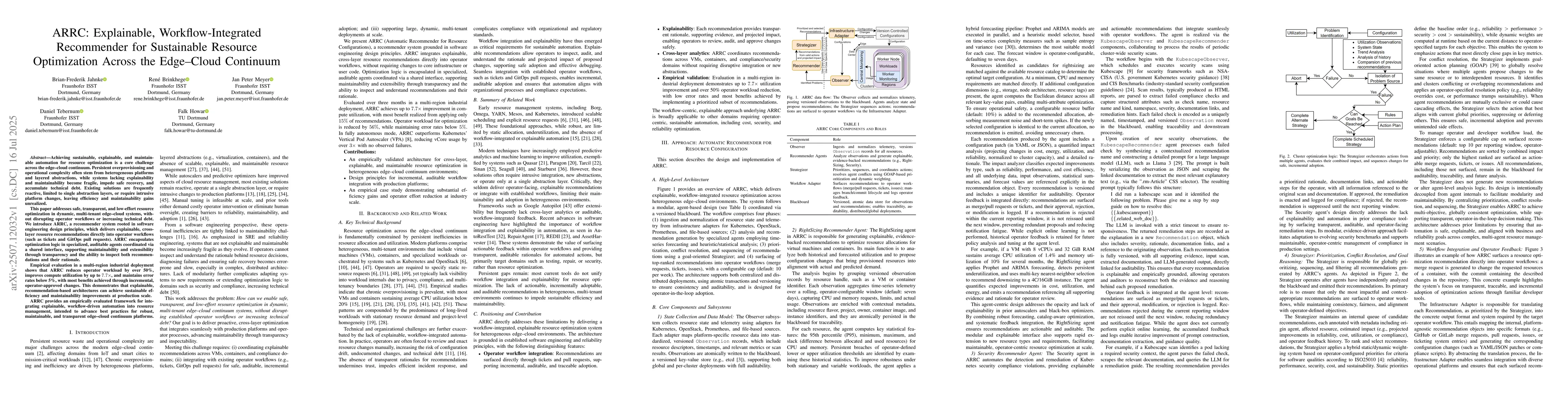 Achieving sustainable, explainable, and maintainable automation for resource optimization is a core challenge across the edge-cloud continuum. Persistent overprovisioning and operational complexity often stem from heterogeneous platforms and layered abstractions, while systems lacking explainability and maintainability become fragile, impede safe recovery, and accumulate technical debt. Existing solutions are frequently reactive, limited to single abstraction layers, or require intrusive platform changes, leaving efficiency and maintainability gains unrealized. This paper addresses safe, transparent, and low-effort resource optimization in dynamic, multi-tenant edge-cloud systems, without disrupting operator workflows or increasing technical debt. We introduce ARRC, a recommender system rooted in software engineering design principles, which delivers explainable, cross-layer resource recommendations directly into operator workflows (such as tickets and GitOps pull requests). ARRC encapsulates optimization logic in specialized, auditable agents coordinated via a shared interface, supporting maintainability and extensibility through transparency and the ability to inspect both recommendations and their rationale. Empirical evaluation in a multi-region industrial deployment shows that ARRC reduces operator workload by over 50%, improves compute utilization by up to 7.7x, and maintains error rates below 5%, with most benefits achieved through incremental, operator-approved changes. This demonstrates that explainable, recommendation-based architectures can achieve sustainable efficiency and maintainability improvements at production scale. ARRC provides an empirically evaluated framework for integrating explainable, workflow-driven automation into resource management, intended to advance best practices for robust, maintainable, and transparent edge-cloud continuum platforms.
