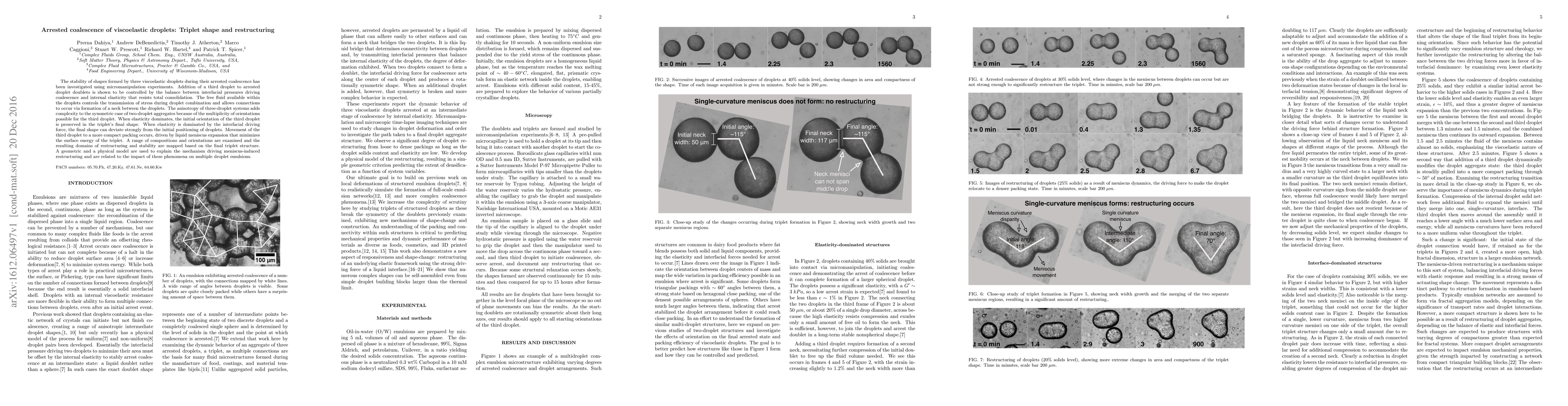 The stability of shapes formed by three viscoelastic droplets during their arrested coalescence has been investigated using micromanipulation experiments. Addition of a third droplet to arrested droplet doublets is shown to be controlled by the balance between interfacial pressures driving coalescence and internal elasticity that resists total consolidation. The free fluid available within the droplets controls the transmission of stress during droplet combination and allows connections to occur via formation of a neck between the droplets. The anisotropy of three-droplet systems adds complexity to the symmetric case of two-droplet aggregates because of the multiplicity of orientations possible for the third droplet. When elasticity dominates, the initial orientation of the third droplet is preserved in the triplet's final shape. When elasticity is dominated by the interfacial driving force, the final shape can deviate strongly from the initial positioning of droplets. Movement of the third droplet to a more compact packing occurs, driven by liquid meniscus expansion that minimizes the surface energy of the triplet. A range of compositions and orientations are examined and the resulting domains of restructuring and stability are mapped based on the final triplet structure. A geometric and a physical model are used to explain the mechanism driving meniscus-induced restructuring and are related to the impact of these phenomena on multiple droplet emulsions.