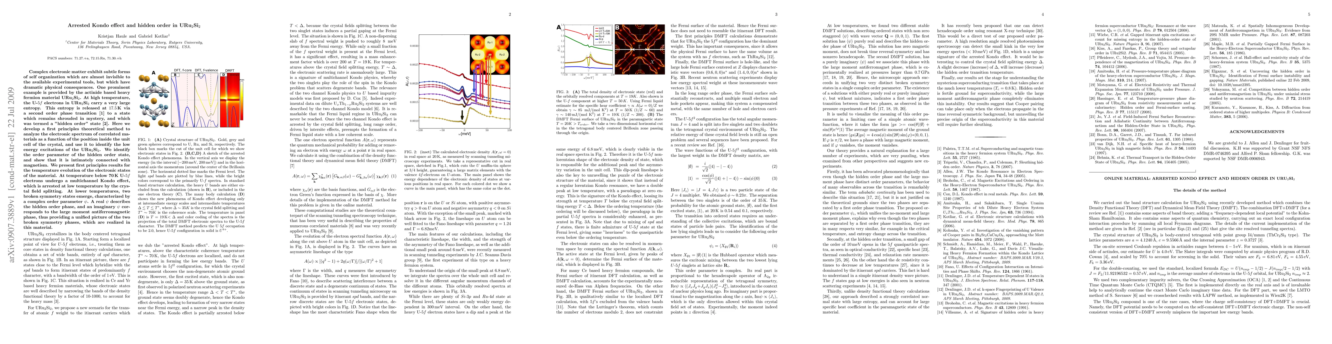 This paper develops a theoretical method to analyze the electronic spectrum of URu_2Si_2, identifying the hidden order state and its connection to magnetism. It reveals an arrested Kondo effect and two broken symmetry states, providing a unified picture of the material's complex low-temperature behavior.