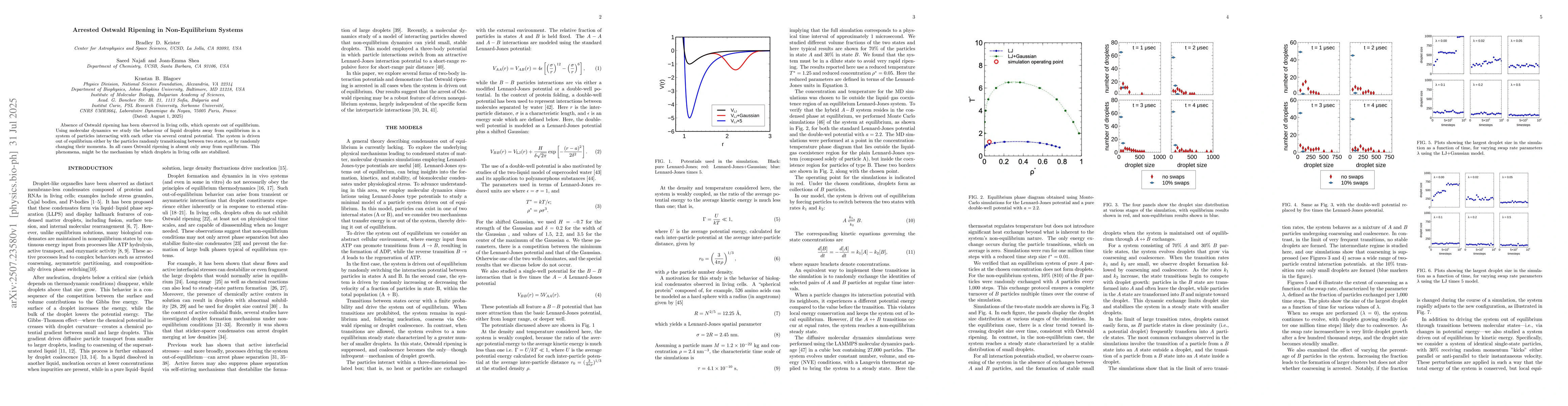 Absence of Ostwald ripening has been observed in living cells, which operate out of equilibrium. Using molecular dynamics we study the behaviour of liquid droplets away from equilibrium in a system of particles interacting with each other via several central potential. The system is driven out of equilibrium either by the particles randomly transitioning between two states, or by randomly changing their momenta. In all cases Ostwald ripening is absent only away from equilibrium. This phenomena, might be the mechanism by which droplets in living cells are stabilized.