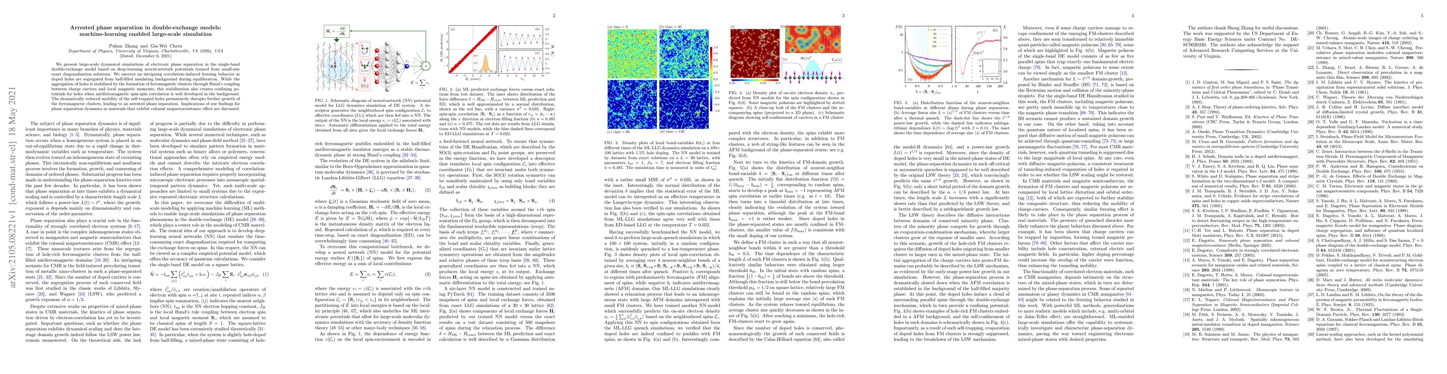 Researchers used machine learning to simulate electronic phase separation in a material with colossal magnetoresistance, finding that doped holes get trapped in ferromagnetic clusters, leading to an arrested phase separation.