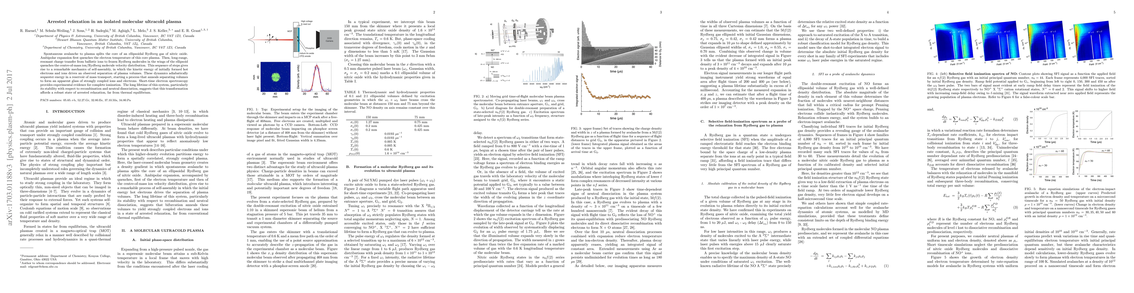 This paper investigates the dynamics of an isolated molecular ultracold plasma formed from an ellipsoidal Rydberg gas of nitric oxide, leading to a self-assembled state of arrested relaxation. The process involves spontaneous avalanche, ambipolar expansion, and resonant charge transfer, resulting in a stable, non-equilibrium state with long-lived separation of plasma volumes.