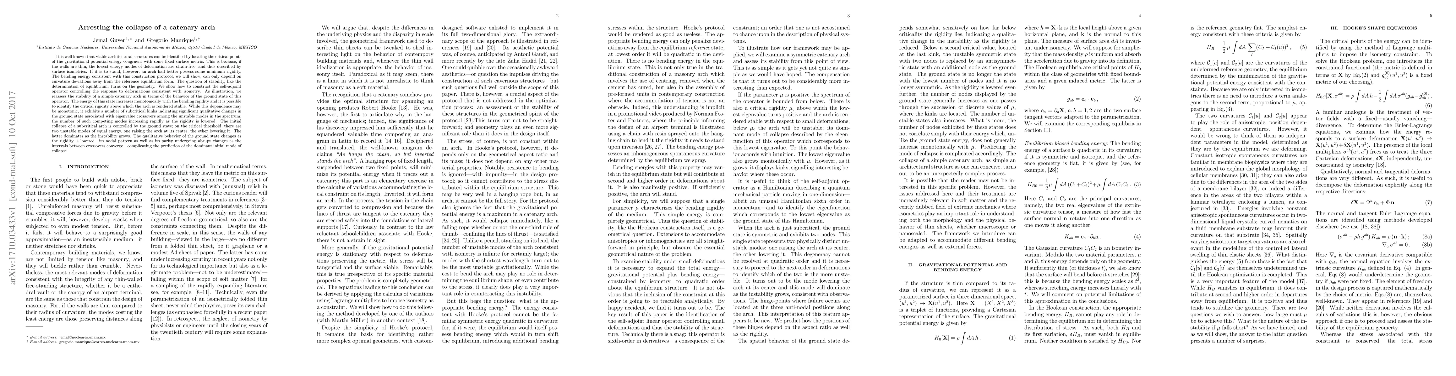 It is well known that viable architectural structures can be identified by locating the critical points of the gravitational potential energy congruent with some fixed surface metric. This is because, if the walls are thin, the lowest energy modes of deformation are strain-free, and thus described by surface isometries. If it is to stand, however, an arch had better possess some minimum rigidity. The bending energy consistent with this construction protocol, we will show, can only depend on curvature deviations away from the reference equilibrium form. The question of stability, like the determination of equilibrium, turns on the geometry. We show how to construct the self-adjoint operator controlling the response to deformations consistent with isometry. As illustration, we reassess the stability of a simple catenary arch in terms of the behavior of the ground state of this operator. The energy of this state increases monotonically with the bending rigidity and it is possible to identify the critical rigidity above which the arch is rendered stable. While this dependence may be monotonic, it exhibits a number of subcritical kinks indicating significant qualitative changes in the ground state associated with eigenvalue crossovers among the unstable modes in the spectrum; the number of such competing modes increasing rapidly as the rigidity is lowered. The initial collapse of a subcritical arch is controlled by the ground state; on the critical threshold, there are two unstable modes of equal energy, one raising the arch at its center, the other lowering it. The latter dominates as the instability grows. The qualitative behavior of the ground state changes as the rigidity is lowered---its nodal pattern as well as its parity undergoing abrupt changes as the intervals between crossovers converge---complicating the prediction of the dominant initial mode of collapse.