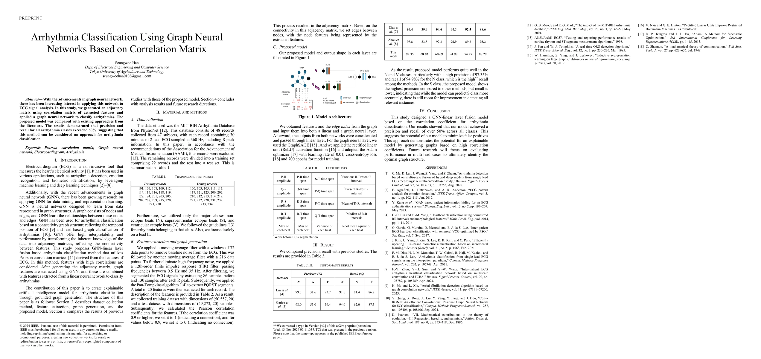 This research proposes a graph neural network model for arrhythmia classification using an adjacency matrix derived from the correlation matrix of extracted ECG features. The model outperformed existing methods, achieving precision and recall above 50% for all arrhythmia classes.