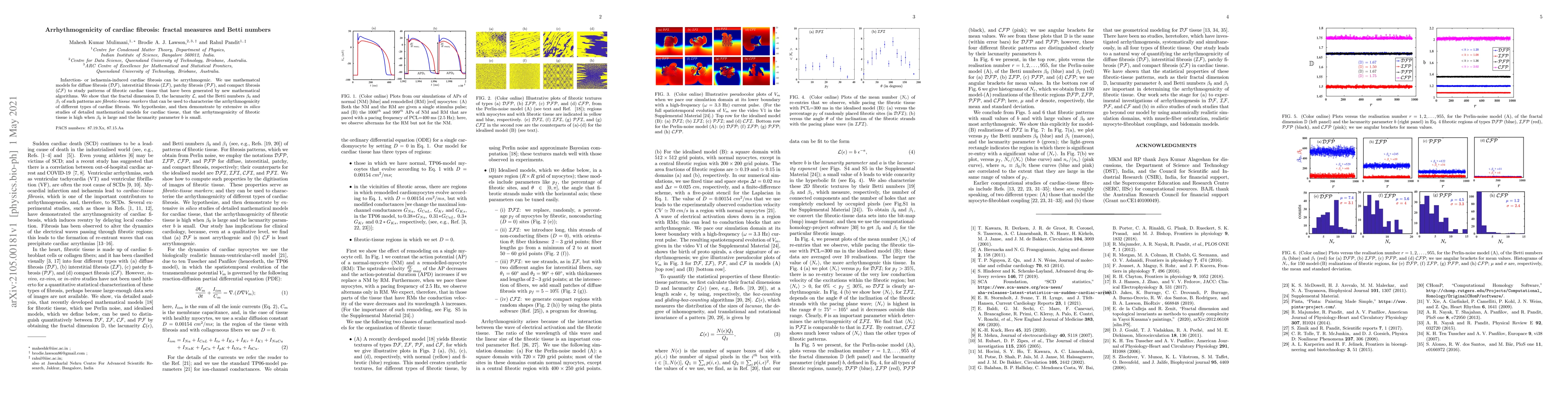 Infarction- or ischaemia-induced cardiac fibrosis can be arrythmogenic. We use mathematcal models for diffuse fibrosis ($\mathcal{DF}$), interstitial fibrosis ($\mathcal{IF}$), patchy fibrosis ($\mathcal{PF}$), and compact fibrosis ($\mathcal{CF}$) to study patterns of fibrotic cardiac tissue that have been generated by new mathematical algorithms. We show that the fractal dimension $\mathbb{D}$, the lacunarity $\mathcal{L}$, and the Betti numbers $\beta_0$ and $\beta_1$ of such patterns are \textit{fibrotic-tissue markers} that can be used to characterise the arrhythmogenicity of different types of cardiac fibrosis. We hypothesize, and then demonstrate by extensive \textit{in silico} studies of detailed mathematical models for cardiac tissue, that the arrhytmogenicity of fibrotic tissue is high when $\beta_0$ is large and the lacunarity parameter $b$ is small.