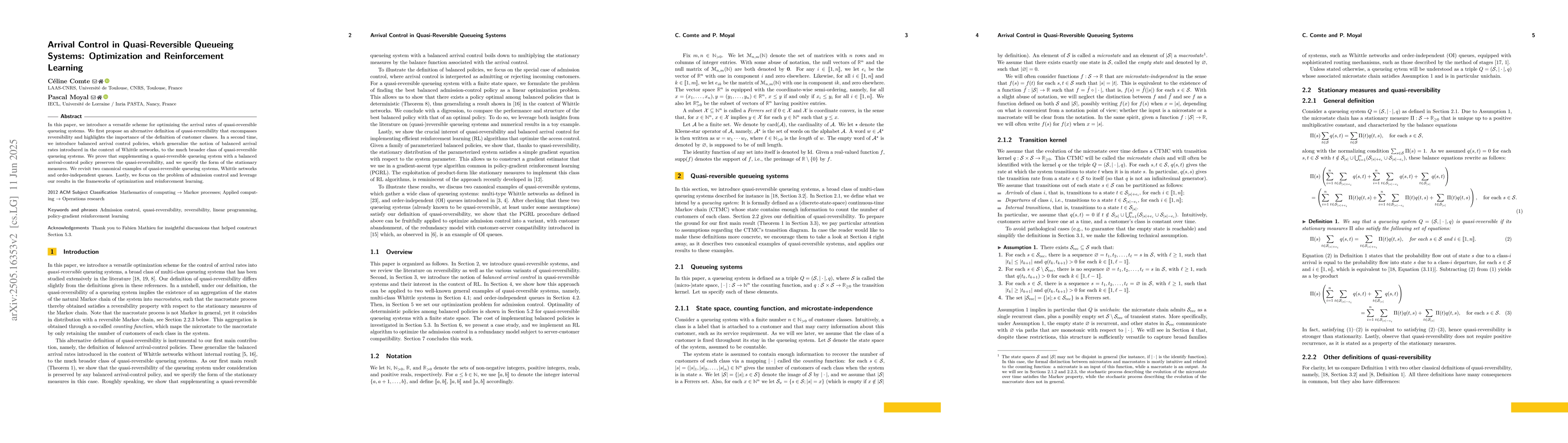 This work distinguishes itself by generalizing balanced arrival rate concepts from Whittle networks to quasi-reversible systems, providing a novel optimization framework that integrates reinforcement learning for admission control.