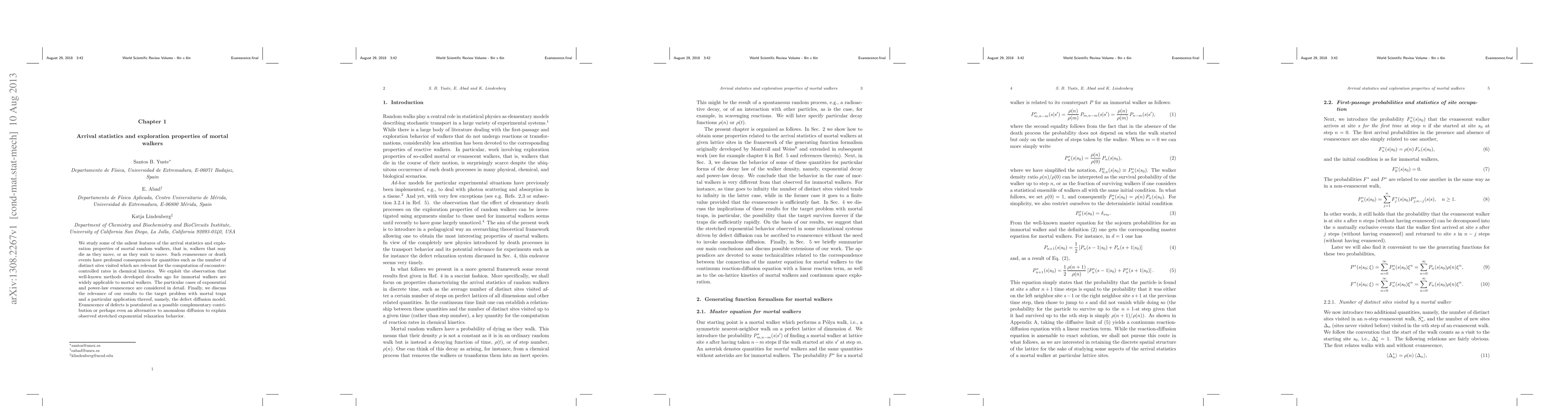 This paper investigates the arrival statistics and exploration properties of mortal random walkers, focusing on their potential death events. It applies classical methods for immortal walkers to mortal walkers, examining exponential and power-law evanescence, and discusses implications for defect diffusion models and stretched exponential relaxation behavior.
