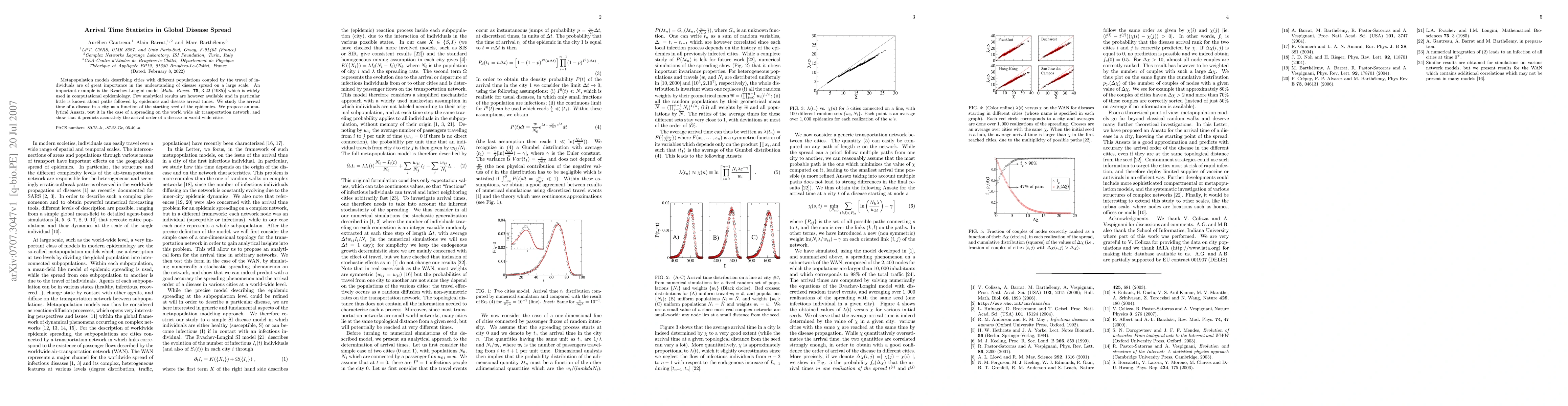 Metapopulation models describing cities with different populations coupled by the travel of individuals are of great importance in the understanding of disease spread on a large scale. An important example is the Rvachev-Longini model [{\it Math. Biosci.} {\bf 75}, 3-22 (1985)] which is widely used in computational epidemiology. Few analytical results are however available and in particular little is known about paths followed by epidemics and disease arrival times. We study the arrival time of a disease in a city as a function of the starting seed of the epidemics. We propose an analytical Ansatz, test it in the case of a spreading on the world wide air transportation network, and show that it predicts accurately the arrival order of a disease in world-wide cities.