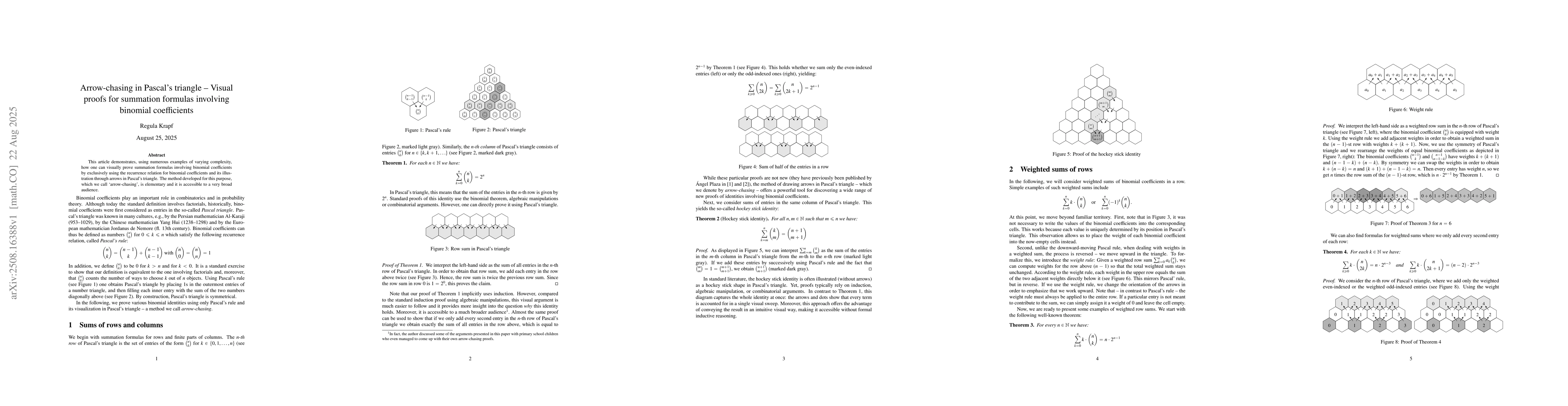 This article demonstrates, using numerous examples of varying complexity, how one can visually prove summation formulas involving binomial coefficients by exclusively using the recurrence relation for binomial coefficients and its illustration through arrows in Pascal's triangle. The method developed for this purpose, which we call "arrow-chasing", is elementary and it is accessible to a very broad audience.
