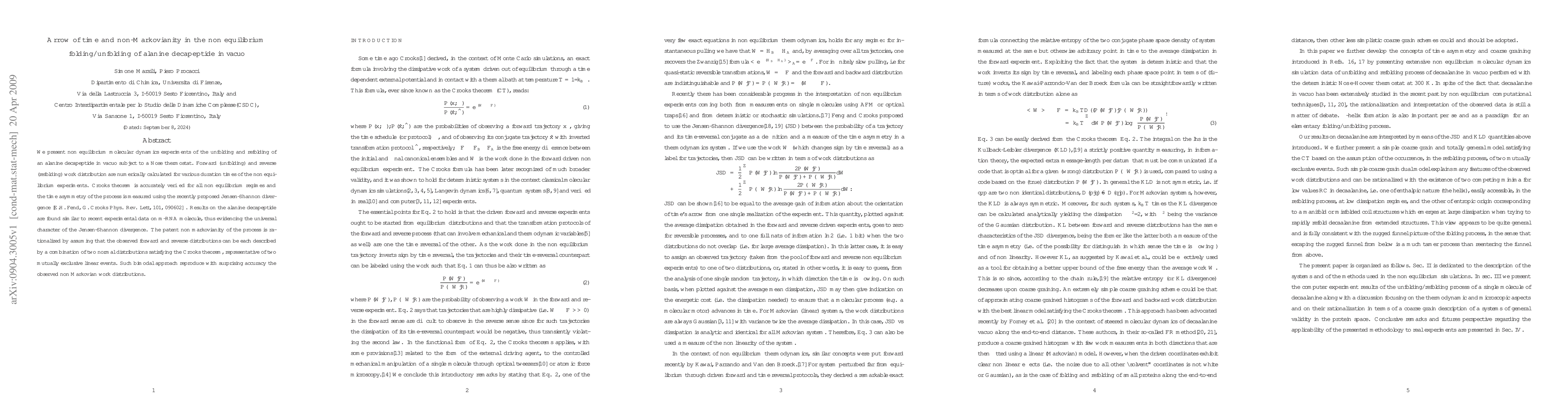 We present non equilibrium molecular dynamics experiments of the unfolding and refolding of an alanine decapeptide in vacuo subject to a Nose-Hoover thermostat. Forward (unfolding) and reverse (refolding) work distribution are numerically calculated for various duration times of the non equilibrium experiments. Crooks theorem is accurately verified for all non equilibrium regimes and the time asymmetry of the process is measured using the recently proposed Jensen-Shannon divergence [E.H. Fend, G. Crooks, Phys. Rev. Lett, 101, 090602] . Results on the alanine decapeptide are found similar to recent experimental data on m-RNA molecule, thus evidencing the universal character of the Jensen-Shannon divergence. The patent non-Markovianity of the process is rationalized by assuming that the observed forward and reverse distributions can be each described by a combination of two normal distributions satisfying the Crooks theorem, representative of two mutually exclusive linear events. Such bimodal approach reproduce with surprising accuracy the observed non Markovian work distributions.