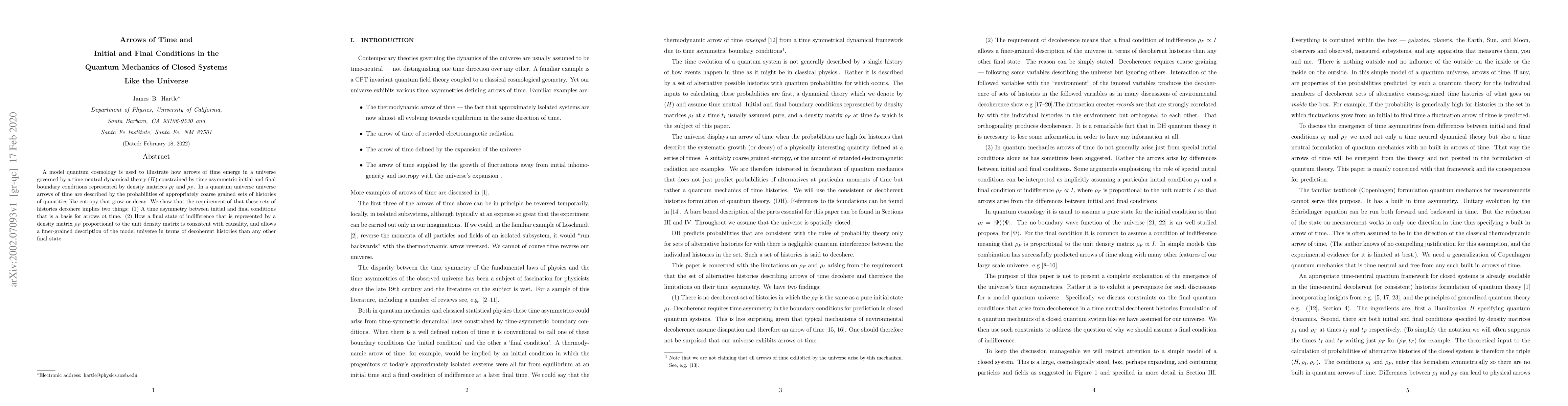 A model quantum cosmology is used to illustrate how arrows of time emerge in a universe governed by a time-neutral dynamical theory constrained by time asymmetric initial and final boundary conditions represented by initial and final density matrices. In a quantum universe universe arrows of time are described by the probabilities of appropriately coarse grained sets of histories of quantities like entropy that grow or decay. We show that the requirement of that these sets of histories decohere implies two things: (1) A time asymmetry between initial and final conditions that is a basis for arrows ot time. (2) How a final state of indifference that is represented by a final density matrix proportional to the unit density matrix is consistent with causality, and allows a finer-grained description of the model universe in terms of decoherent histories than any other final state.