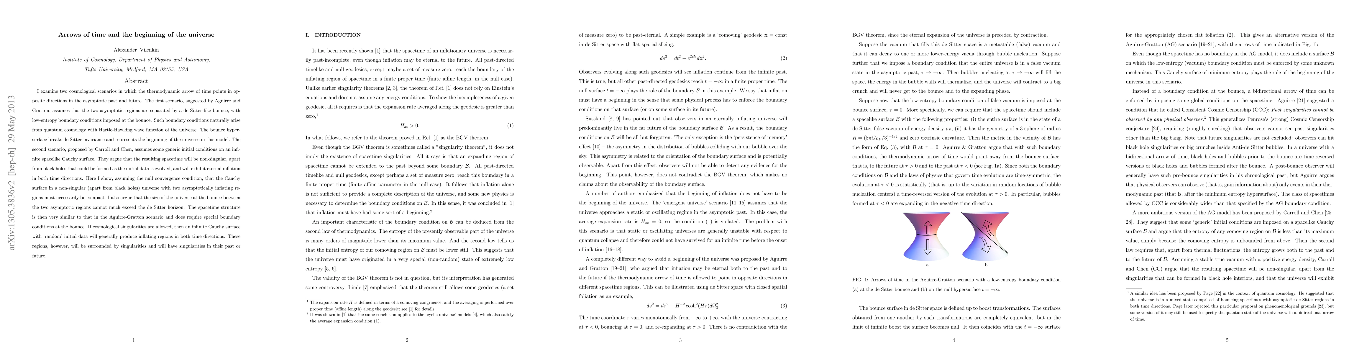 The paper presents a detailed analysis of two cosmological models with opposite thermodynamic arrows of time, demonstrating the necessity of a compact Cauchy surface in a non-singular universe with asymptotically inflating regions.