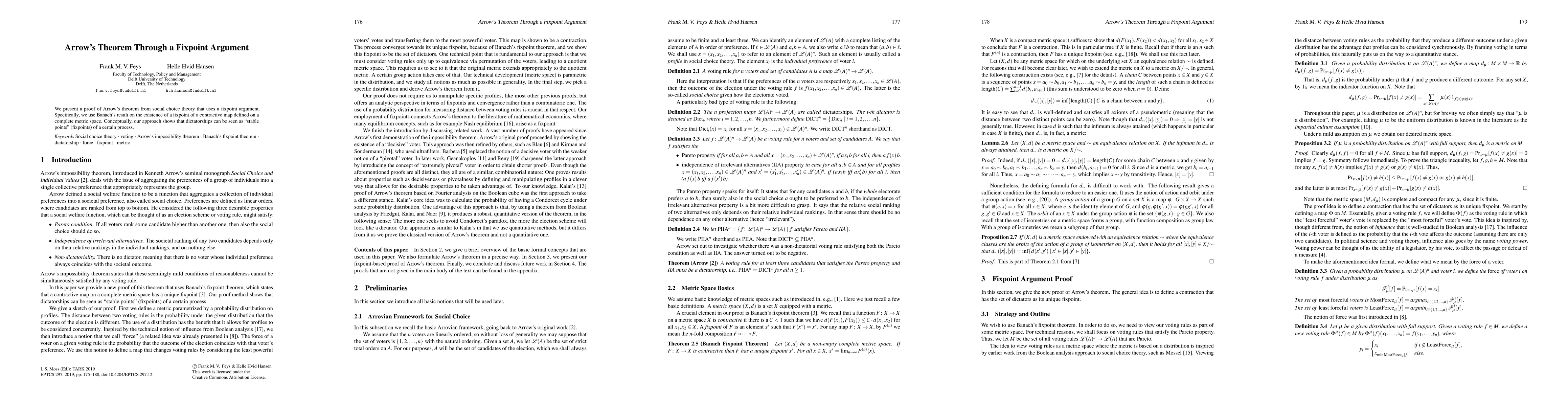 Arrow's theorem is proven using a fixpoint argument based on Banach's theorem, demonstrating that dictatorships emerge as fixpoints of a specific social choice process. This approach provides a novel perspective on the impossibility of fair collective decision-making.