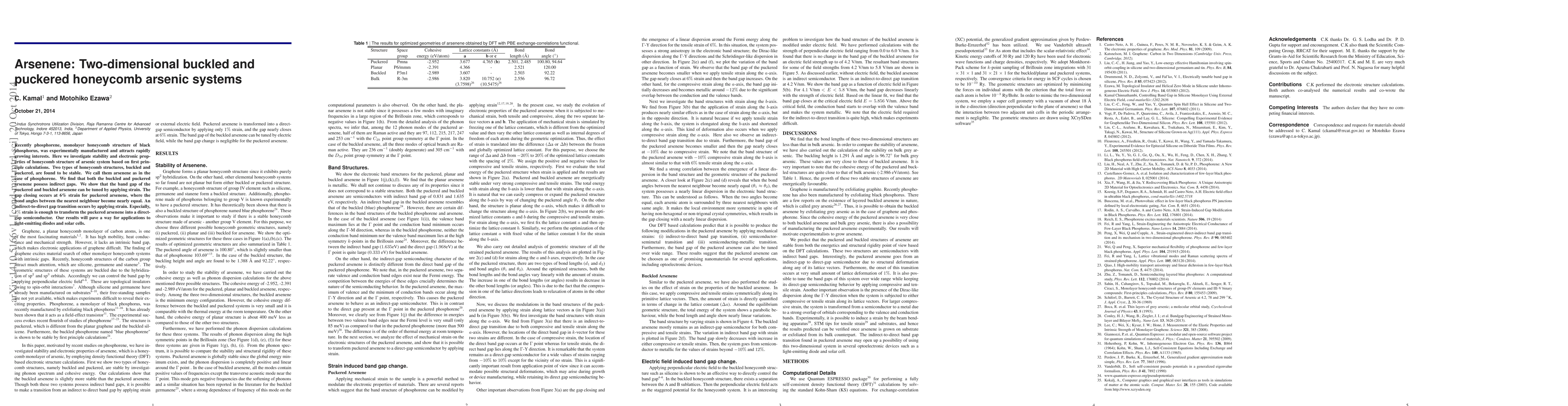 This paper investigates the stability and electronic properties of two-dimensional arsenic systems, termed "arsenene," analogous to phosphorene. Both buckled and puckered arsenene structures exhibit indirect band gaps that can be tuned by strain, potentially enabling applications in light-emitting diodes and solar cells.