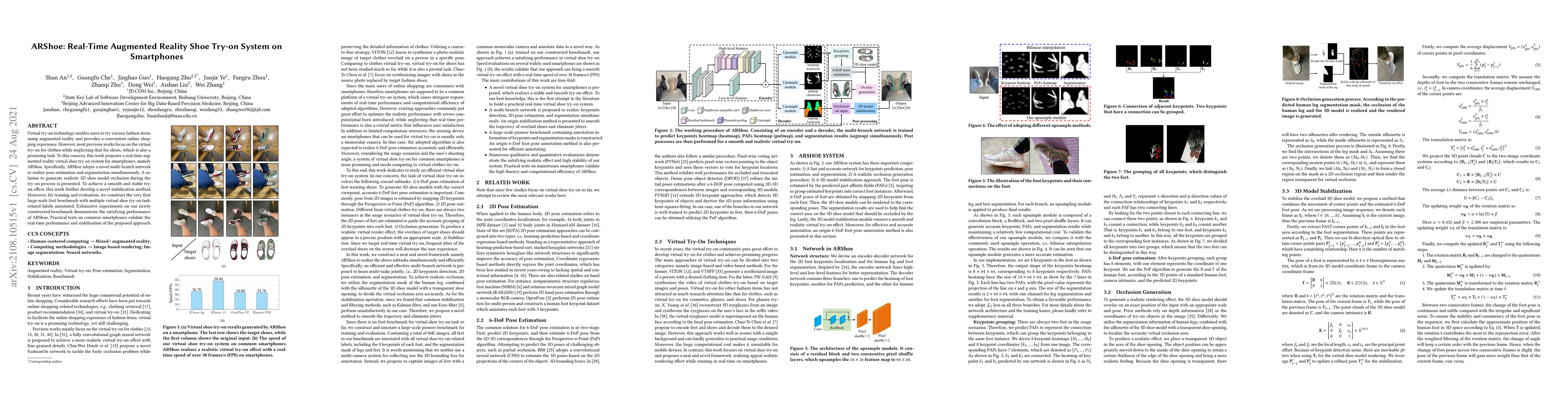 ARShoe presents a real-time augmented reality shoe try-on system for smartphones, utilizing a multi-branch network for simultaneous pose estimation and segmentation, and a stabilization method to ensure smooth performance. The system is evaluated on a newly constructed large-scale foot benchmark, demonstrating effective and real-time shoe try-on capabilities.